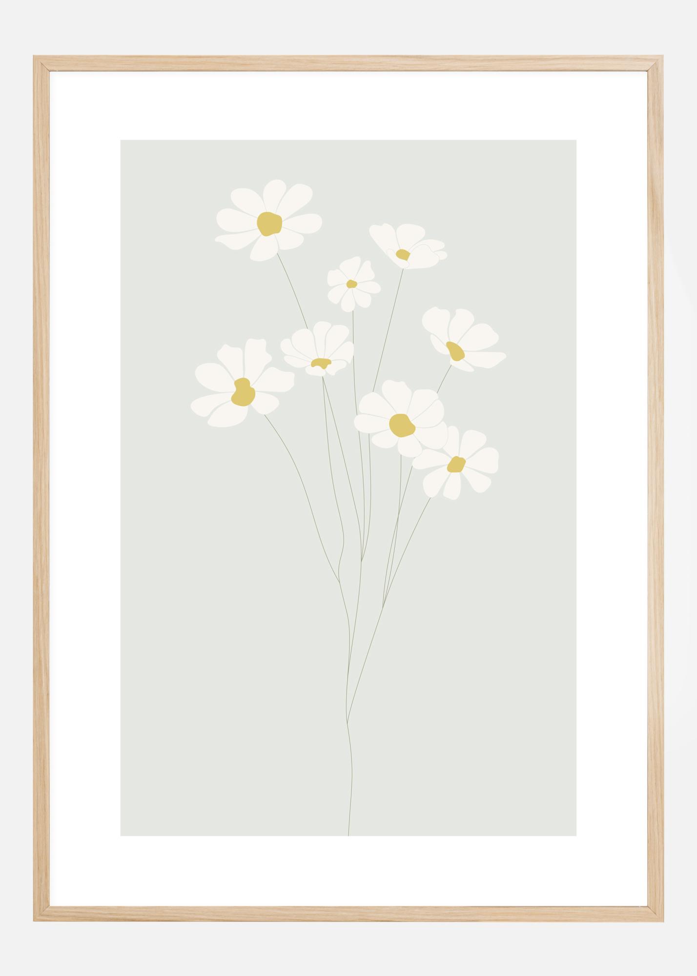 Un poster sottile con una stampa di una margherita dal delicato aspetto. I semplici fiori bianchi e gialli si estendono verso l'alto su steli sottili su uno sfondo blu pallido morbido. Appendi questa immagine nella camera da letto del tuo bambino per creare un'atmosfera rilassante ma dolce.