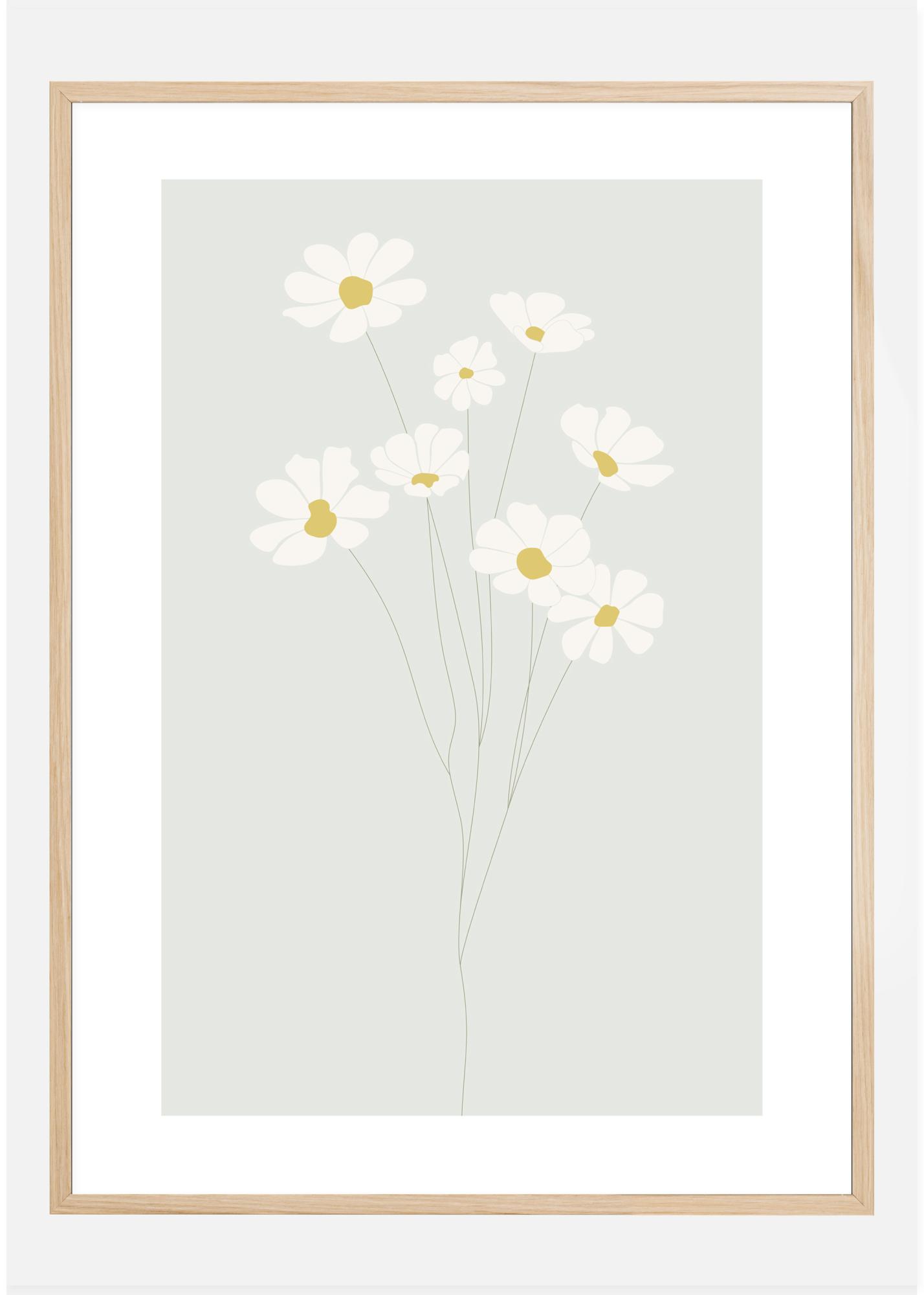 Un poster sottile con una stampa di una margherita dal delicato aspetto. I semplici fiori bianchi e gialli si estendono verso l'alto su steli sottili su uno sfondo blu pallido morbido. Appendi questa immagine nella camera da letto del tuo bambino per creare un'atmosfera rilassante ma dolce.