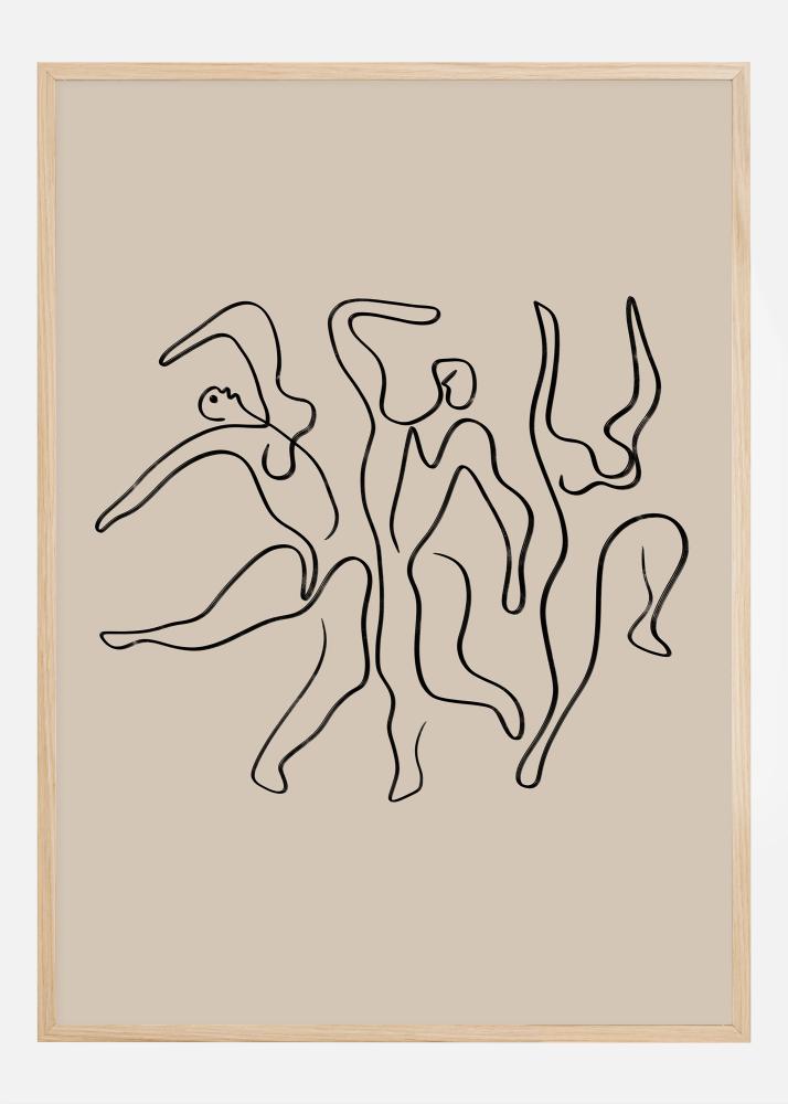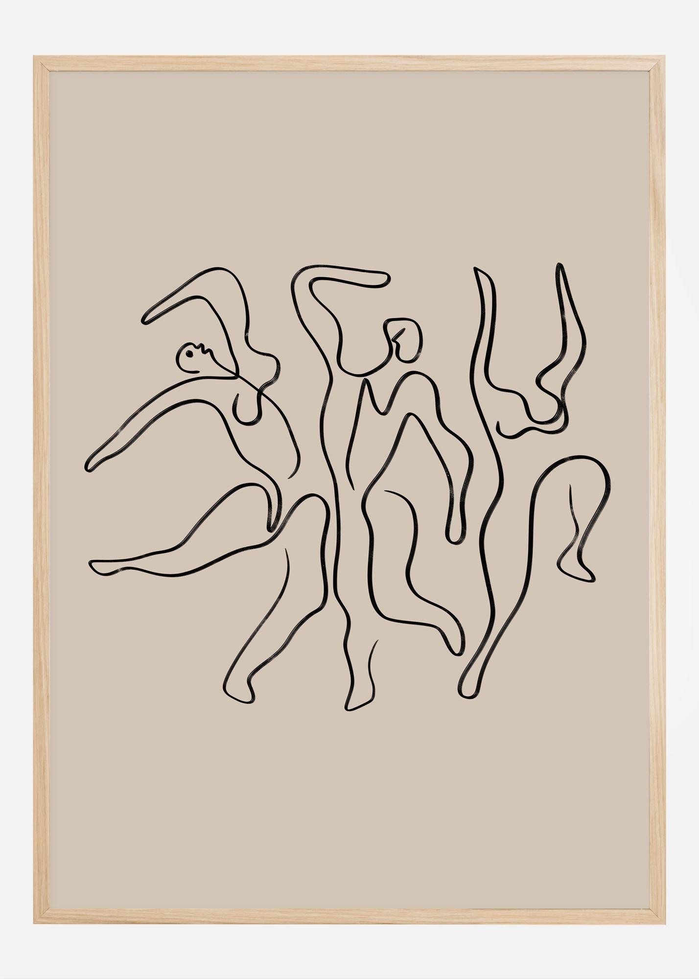 Questo poster artistico presenta una serie di figure astratte che con le loro linee fluide evocano una sensazione di movimento e danza. L'illustrazione semplice ma espressiva in nero su uno sfondo beige tranquillo offre un'espressione minimalista ma vivace. Questo tipo di motivo è perfetto per coloro che apprezzano opere d'arte sottili ma potenti che ispirano movimento e libertà.