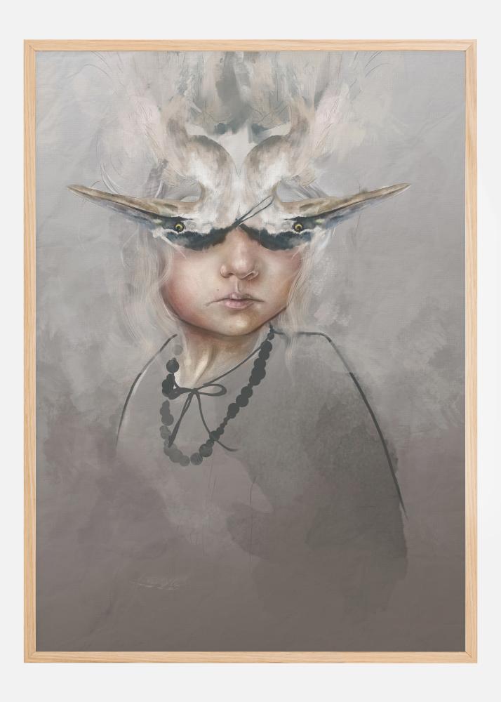 Un poster misterioso con una persona avvolta nel fumo. La testa è coperta da un cappello che sembra essere in fiamme e assomiglia a due uccelli capovolti o a un teschio. Gli occhi sono misteriosamente ombreggiati e la persona emana una calma misteriosa. Appendi questa opera d'arte nella tua casa e permetti ulteriori interpretazioni.