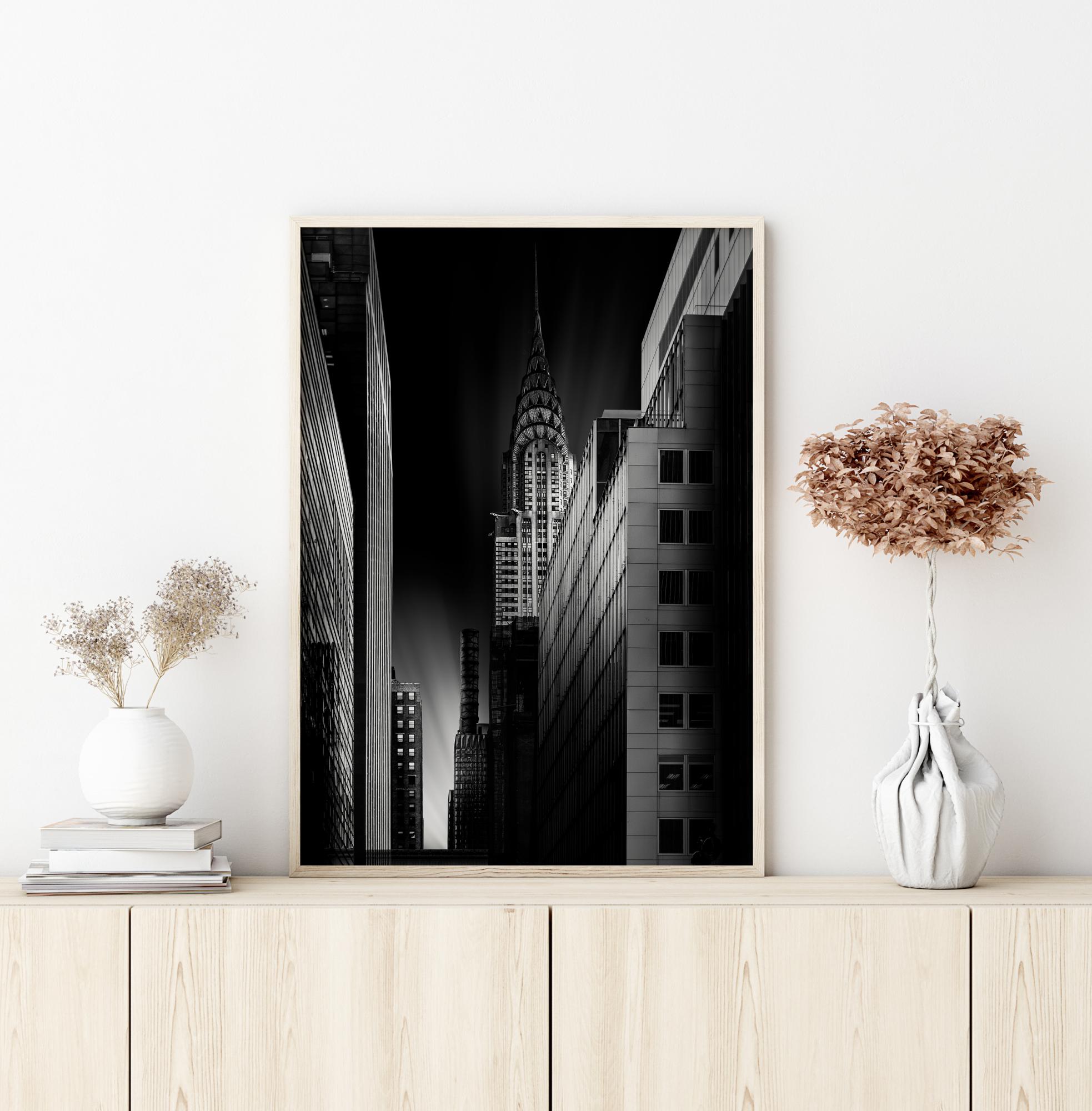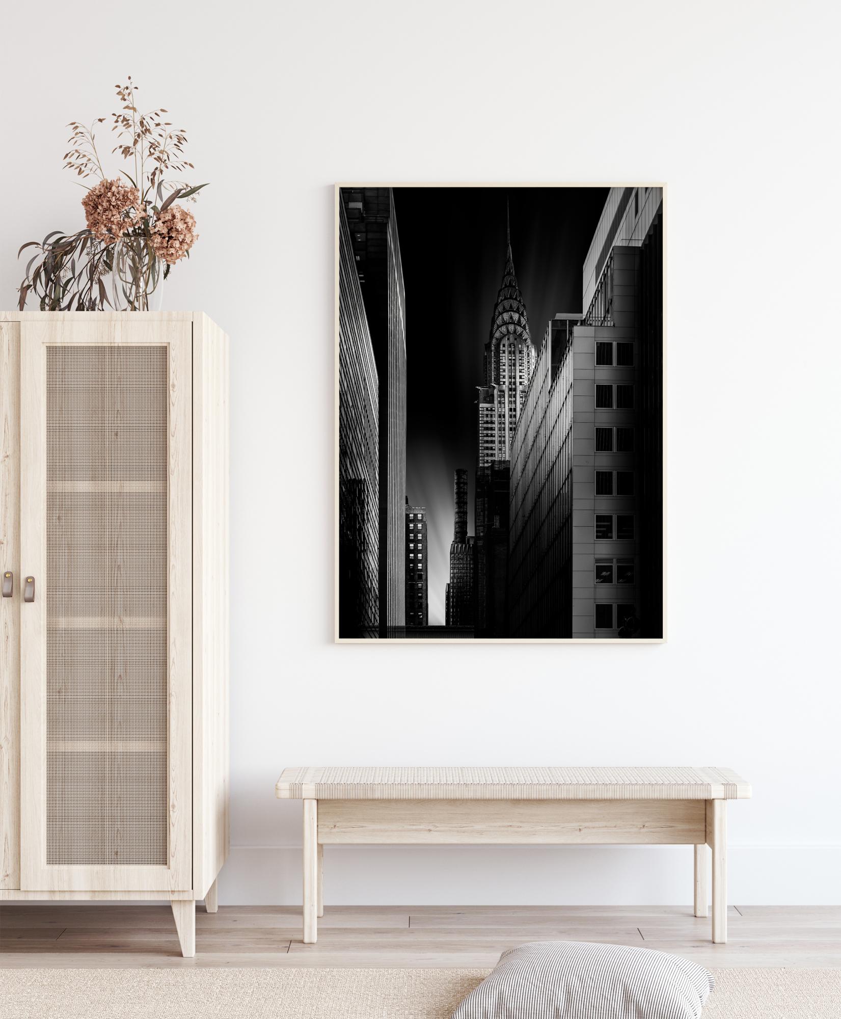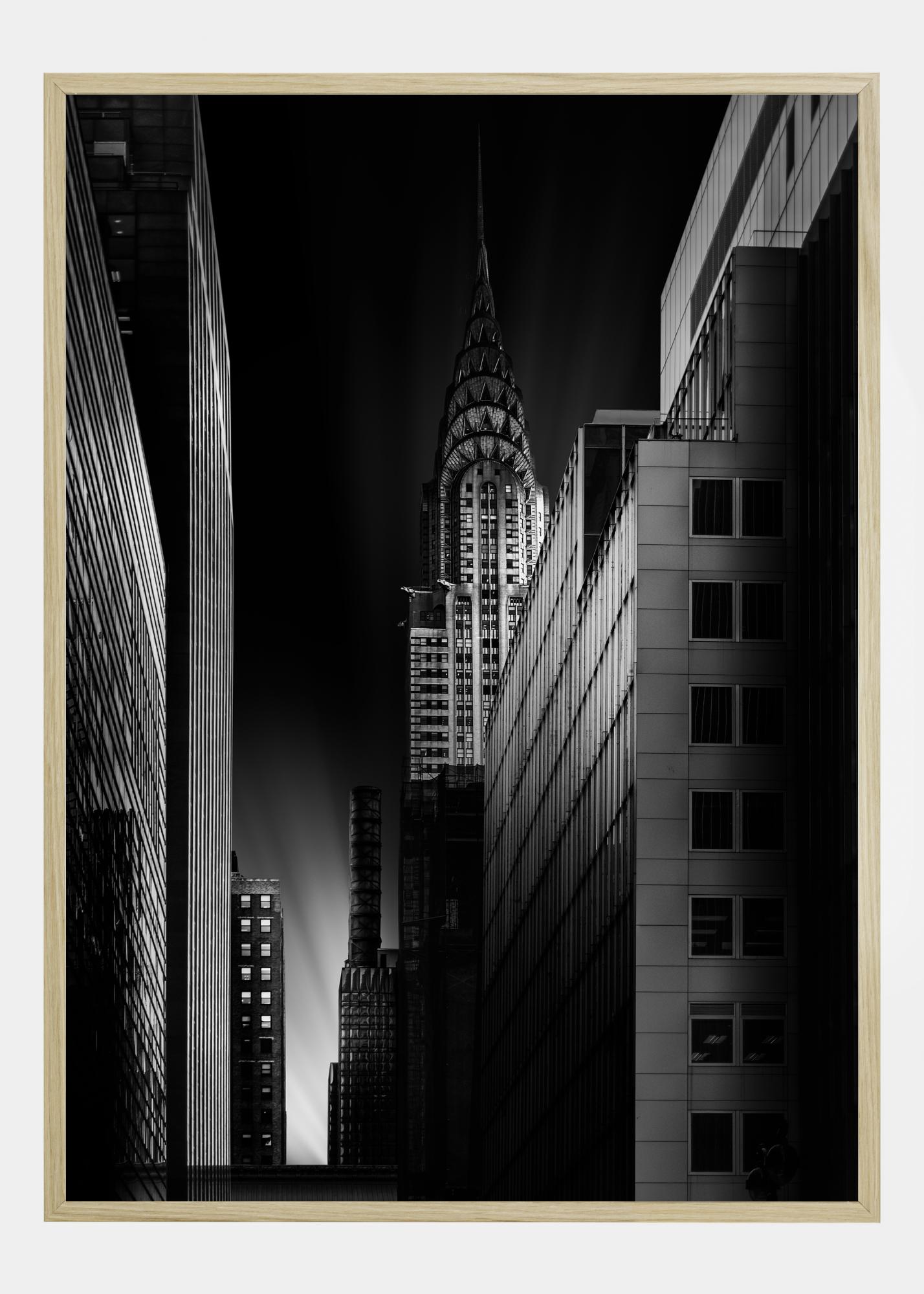 Un poster urbano con l'edificio Chrysler di notte. Una strada stretta porta lo sguardo verso un lampo di luce nel cielo. A destra si può vedere l'ombrosa costruzione in questa foto leggermente misterioso. L'immagine è appesa su una parete bianca in una galleria privata.