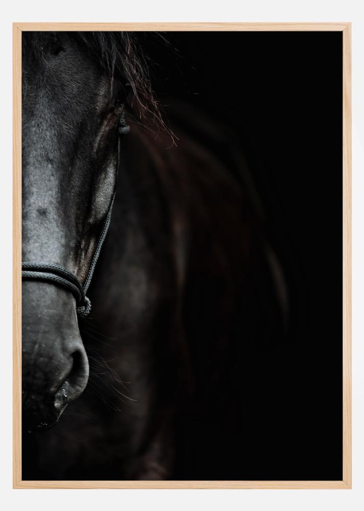 Un poster fotografico per gli amanti dei cavalli! Qui c'è un cavallo scuro fotografato frontalmente su uno sfondo scuro. Il viso è splendidamente illuminato mentre la parte posteriore del cavallo si fonde con lo sfondo. Completa con qualcosa dalla nostra vasta selezione di cornici.
