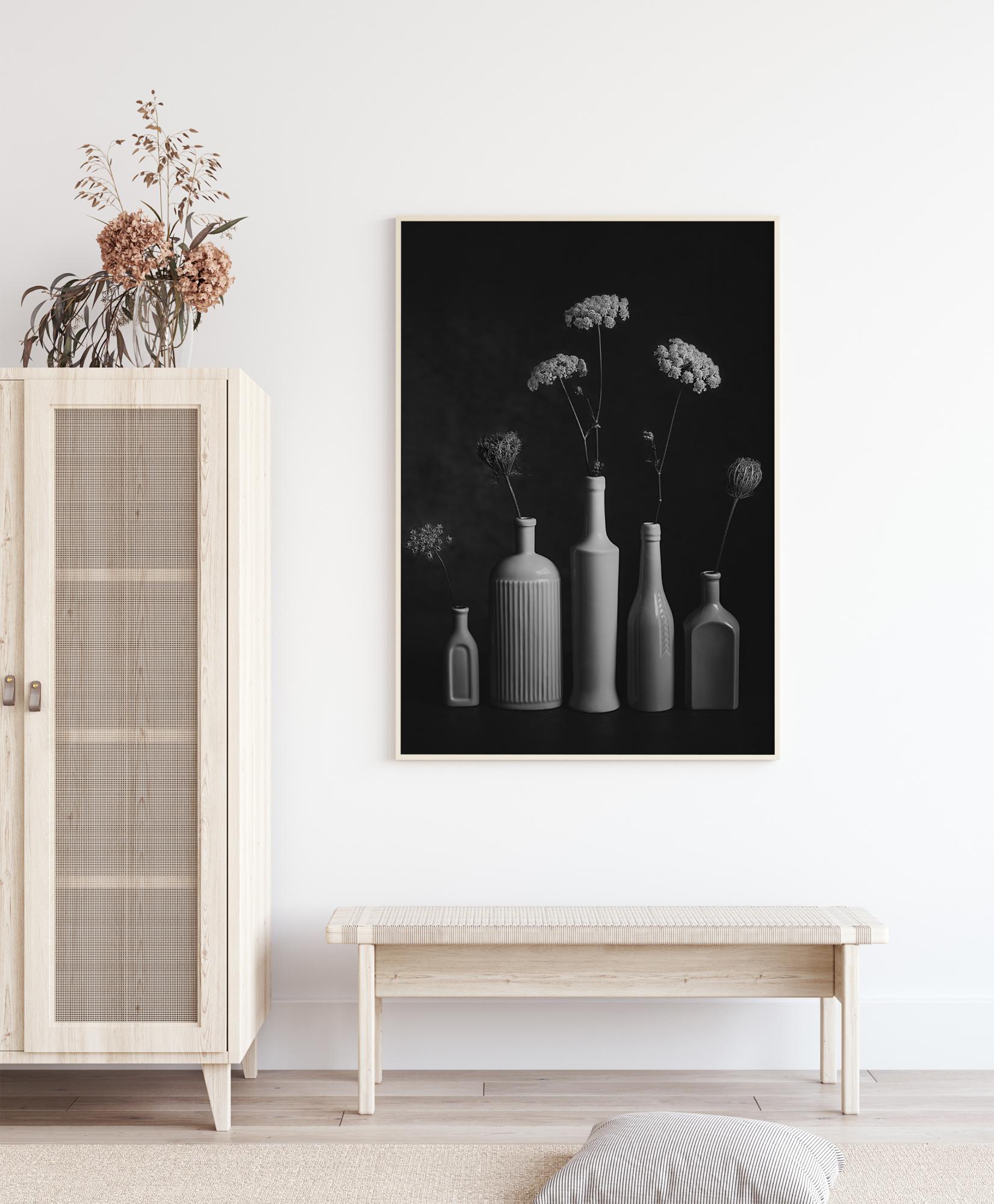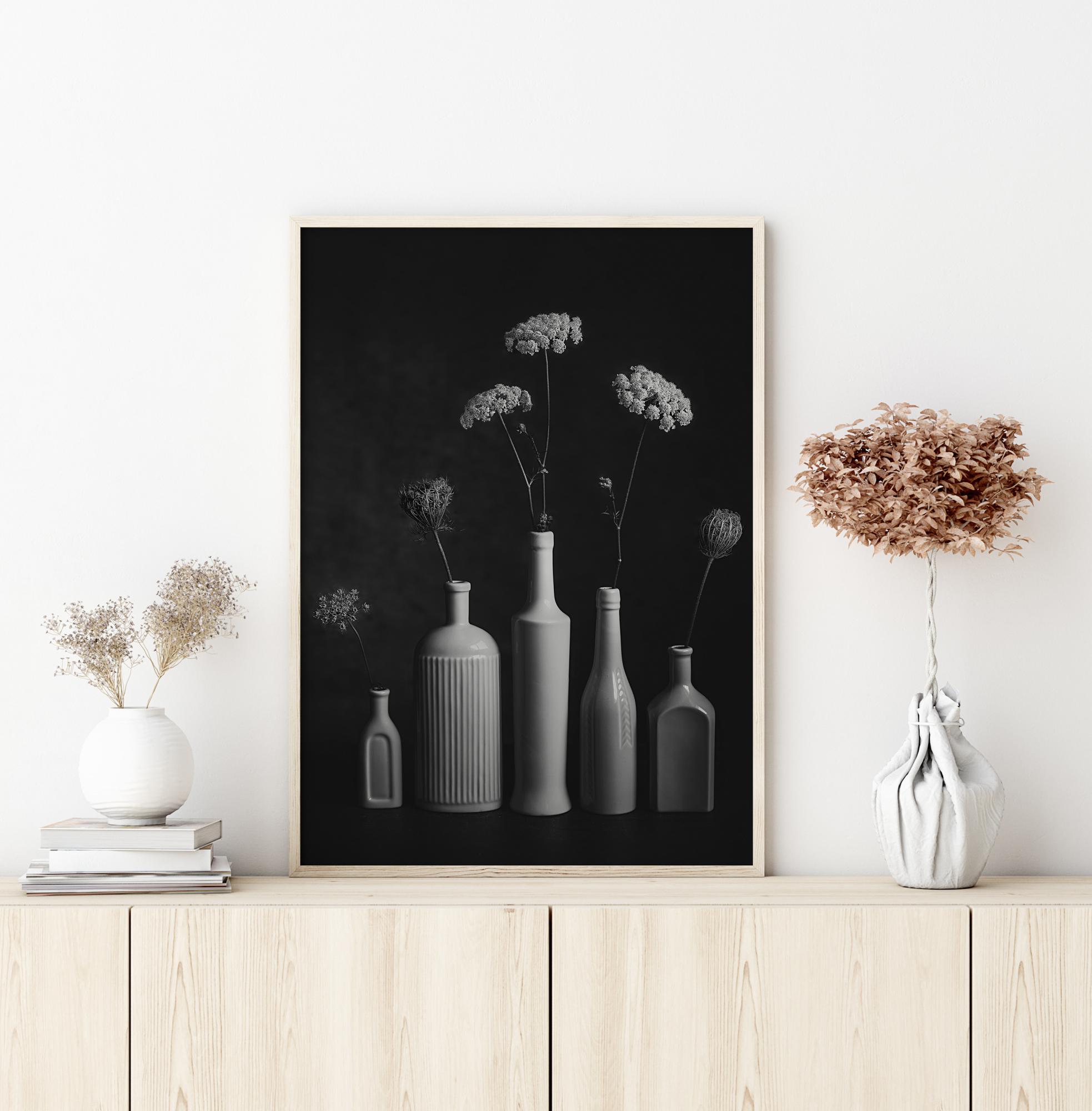 Un poster tradizionale con bottiglie e fiori su uno sfondo nero semplice. Aggiungi un tocco di stile pittorico olandese alla tua casa con l'aiuto di questo set semplice ma forte di bottiglie e fiori.