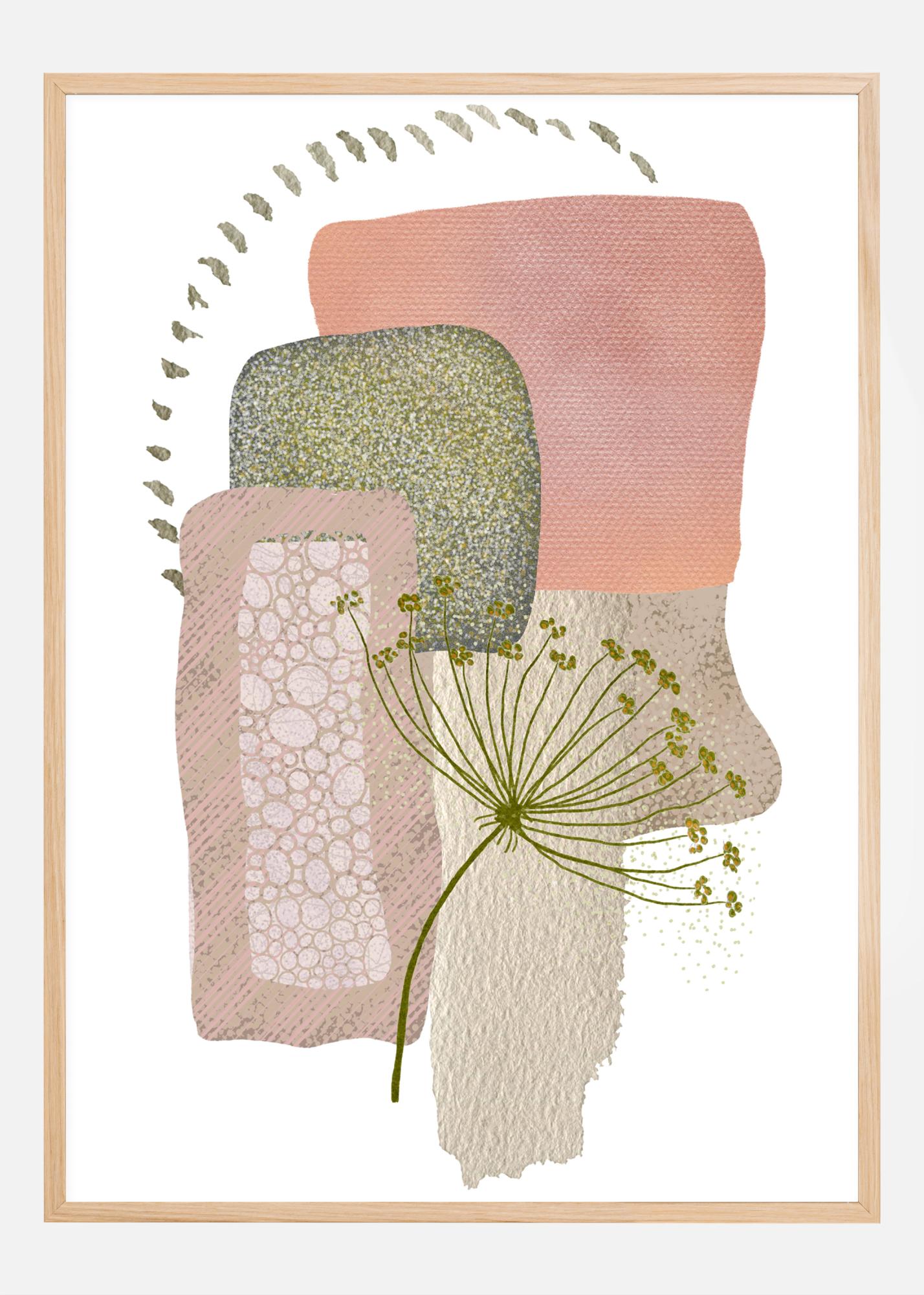 Questo poster trasmette una sensazione di calma e bellezza attraverso la sua combinazione rilassata di tonalità morbide e forme astratte. Al centro della composizione vi è un delicato stelo di fiore che si estende verso l'alto, con i suoi piccoli germogli verdi che vengono alleggeriti da un sottile e grazioso stelo. Gli strati di texture e colore creano una profondità e un interesse che cattura l'occhio e invita a una lunga osservazione. Con la sua tavolozza calmante di rosa e verde, questa stampa d'arte trasmette una sensazione di tranquillità e semplicità della natura, rendendola un bellissimo aggiungo in ogni casa.