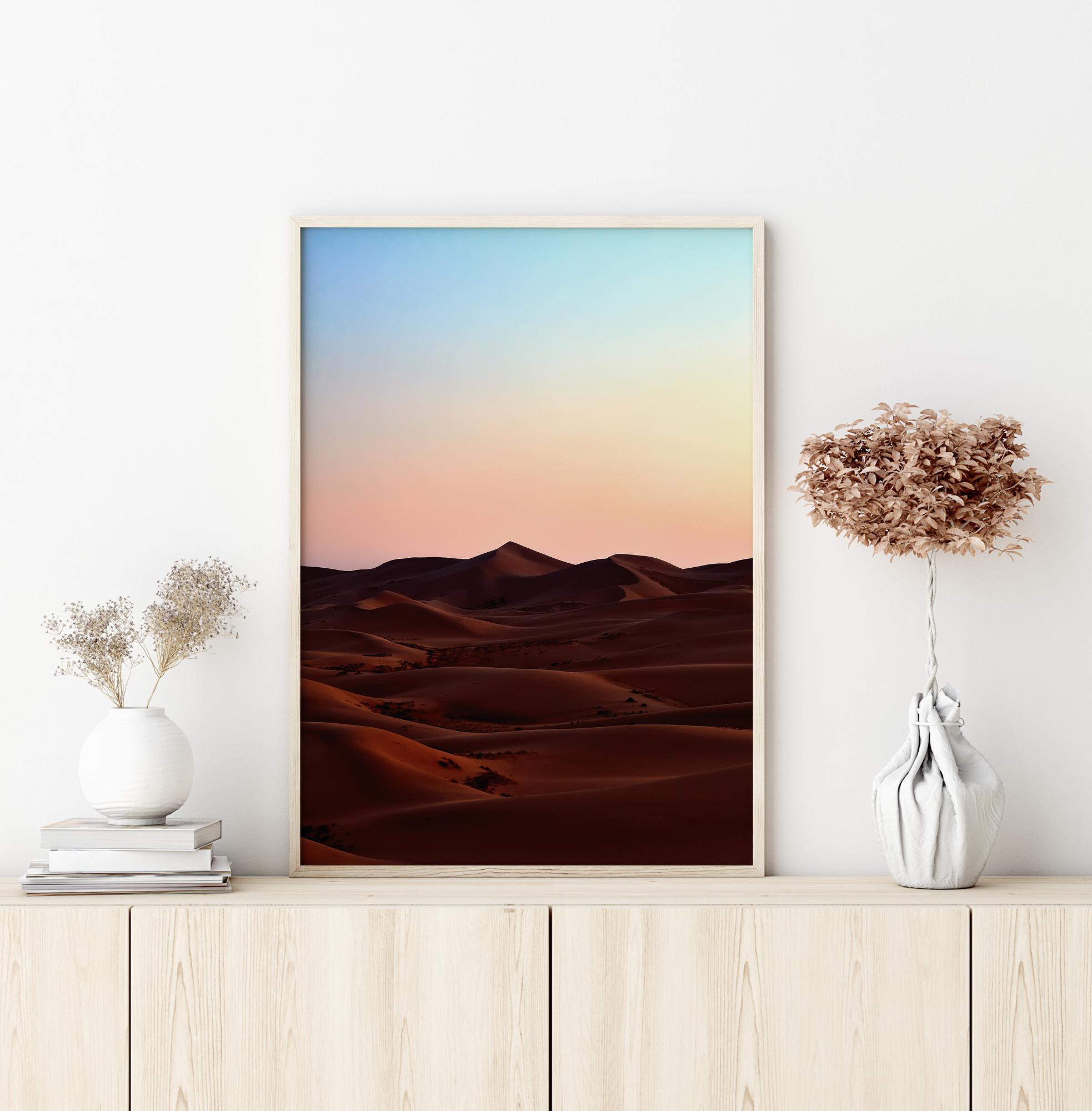 Un poster suggestivo con un paesaggio desertico. Il deserto rosso intenso mette in risalto le dune di sabbia ondulate, guidando lo sguardo attraverso il paesaggio. Il cielo delicatamente blu e le sfumature rosa nebbiose danno una sensazione di mattina presto. Goditi gli ampi spazi della natura quando hai questa immagine appesa al muro.