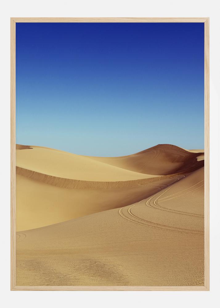 Un vivace poster con fantastiche dune di sabbia gialla con due tracce di pneumatici in una curva. Le luminose dune di sabbia sono accentuate dall'emozionante azzurro del cielo. Perdetevi nella vastità con questa fantastica opera d'arte appesa alla vostra parete.