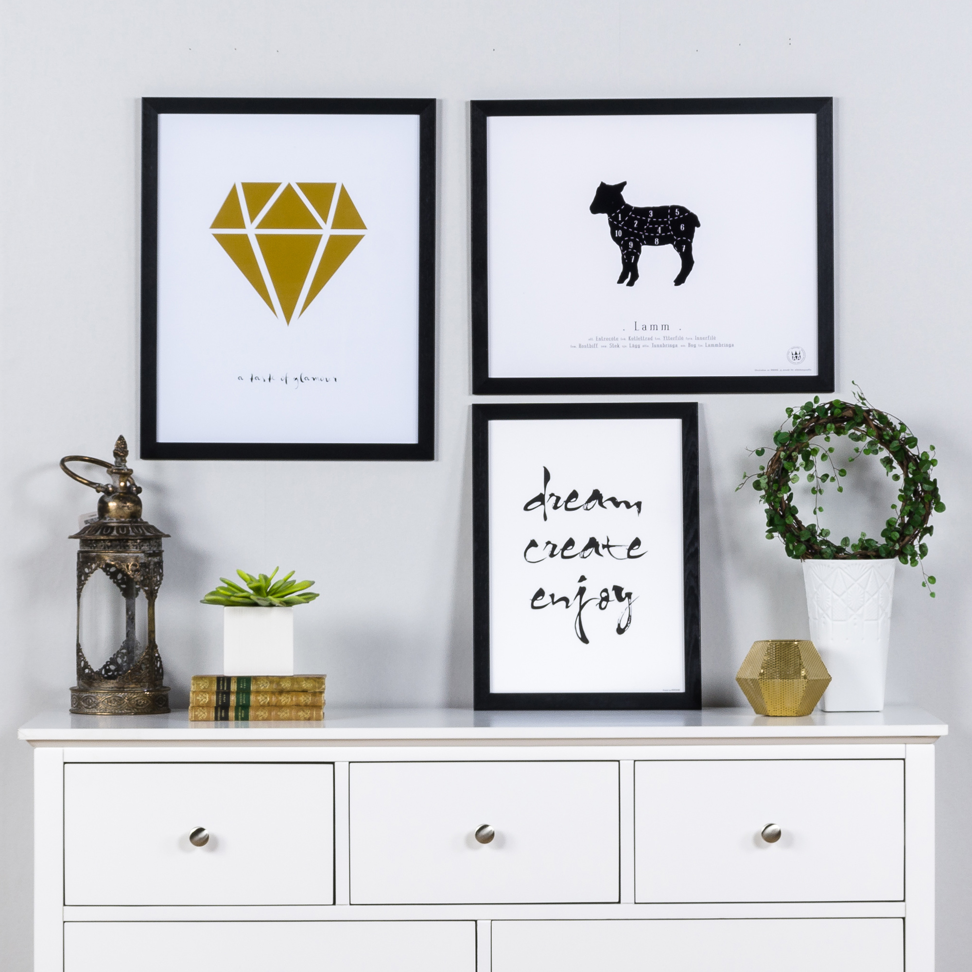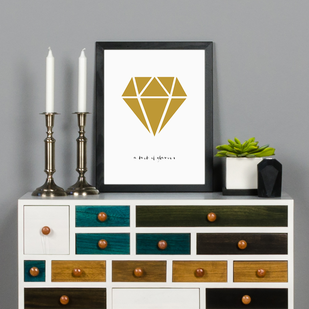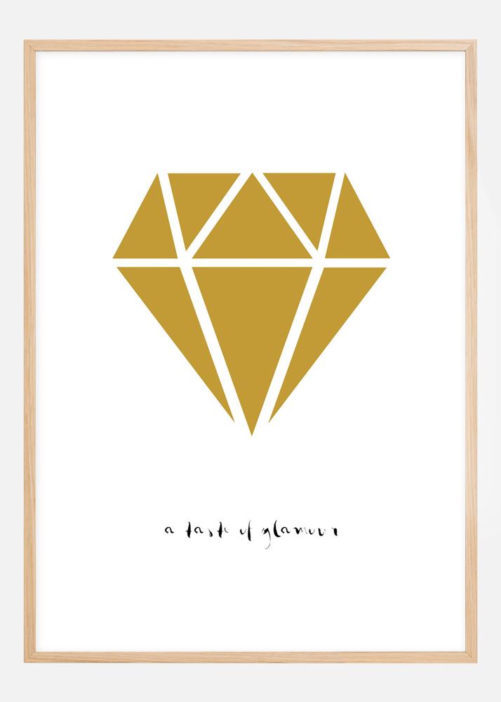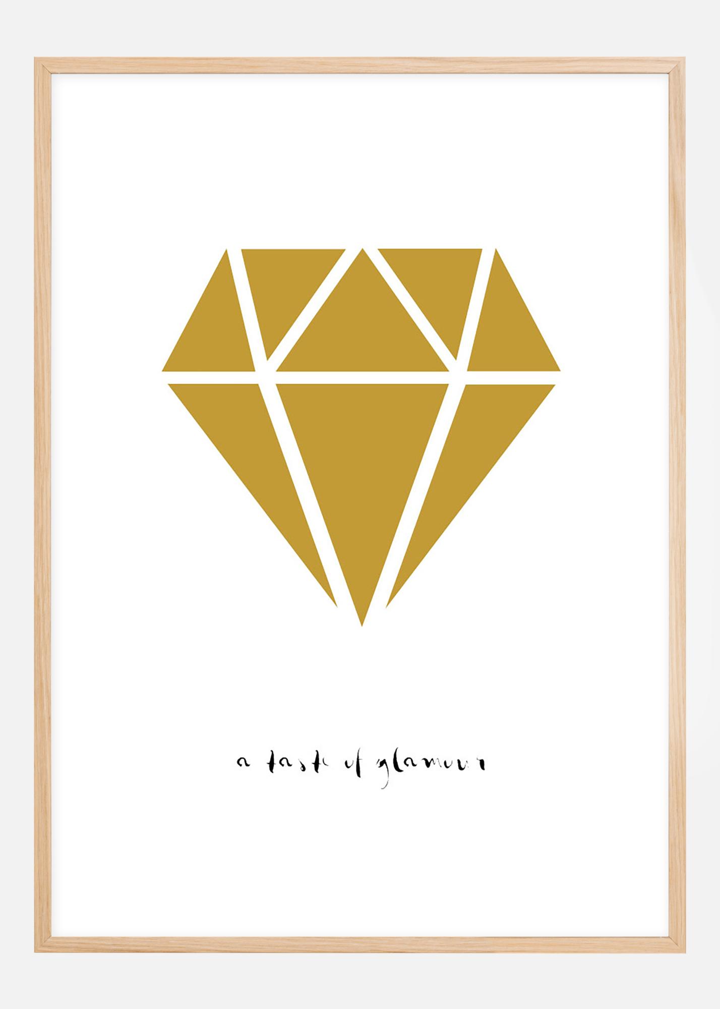 I diamanti sono i migliori amici di una ragazza, ma qui in una forma più accessibile sotto forma di una stampa grafica. Dà alla casa una sensazione di lusso e sfarzo con un bel poster che ha come motivo un diamante dorato su sfondo bianco, con il testo "a taste of glamour" - "a taste of glamour" - "un assaggio di glamour". Tutti hanno bisogno di un po' di glamour ogni tanto e questo è un modo semplice per aggiungerne un po' di più nella vita quotidiana.