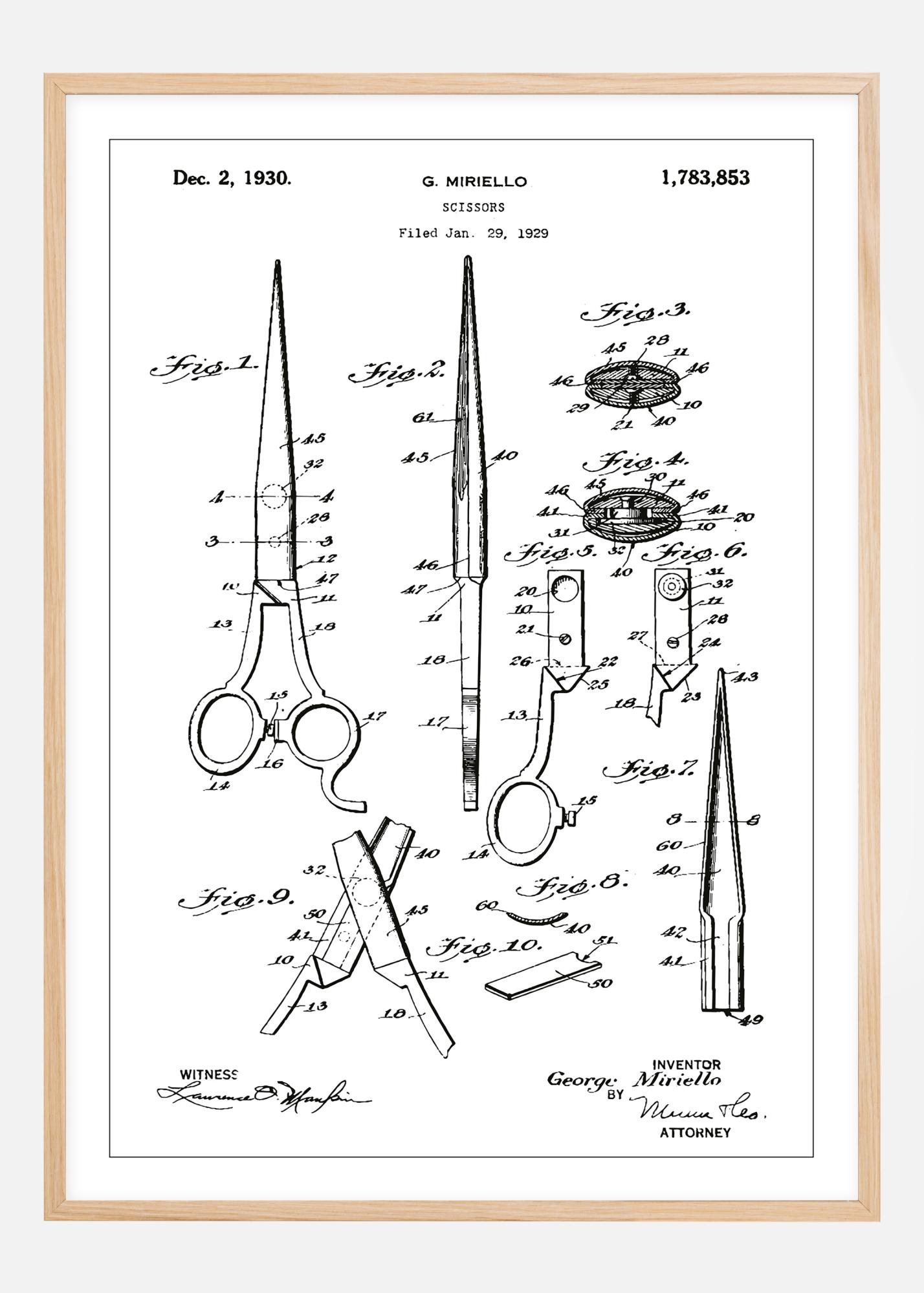 Elegante e istruttiva, questa locandina brevettuale raffigura il design innovativo di G. Mirello delle forbici, brevettato il 2 dicembre 1930 con il numero 1,783,853. È una visione educativa sull'evoluzione di uno strumento dell'inizio del XX secolo, dalle lame affilate con precisione ai manici decorati con eleganza. Ogni dettaglio del disegno brevettuale è rappresentato con precisione, mostrando la competenza tecnica e la capacità di design che caratterizzavano le invenzioni di quell'epoca.