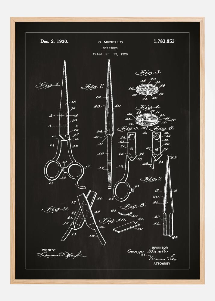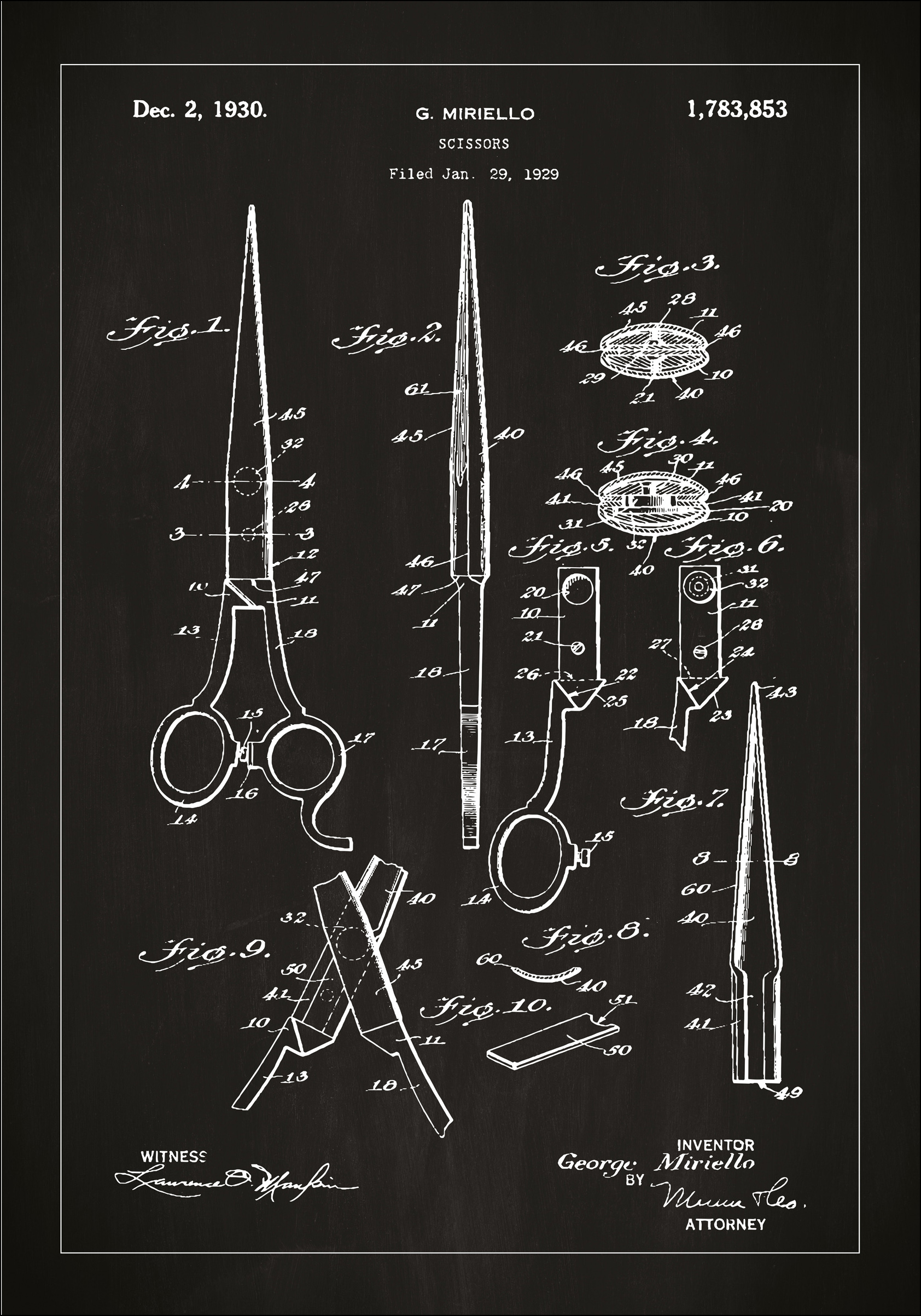 Questo distinto poster di brevetto è un omaggio a un'icona del design classico le forbici. Raffigura il brevetto di G. Mirello, che è stato rilasciato il 2 dicembre 1930 con numero di brevetto 1,783,853, dopo essere stato depositato il 29 gennaio 1929. Con schizzi accurati che mostrano diversi angoli e parti delle forbici, dalle lame appuntite ai manici ergonomicamente progettati, questo disegno di brevetto cattura l'essenza stessa dell'artigianato e del design.