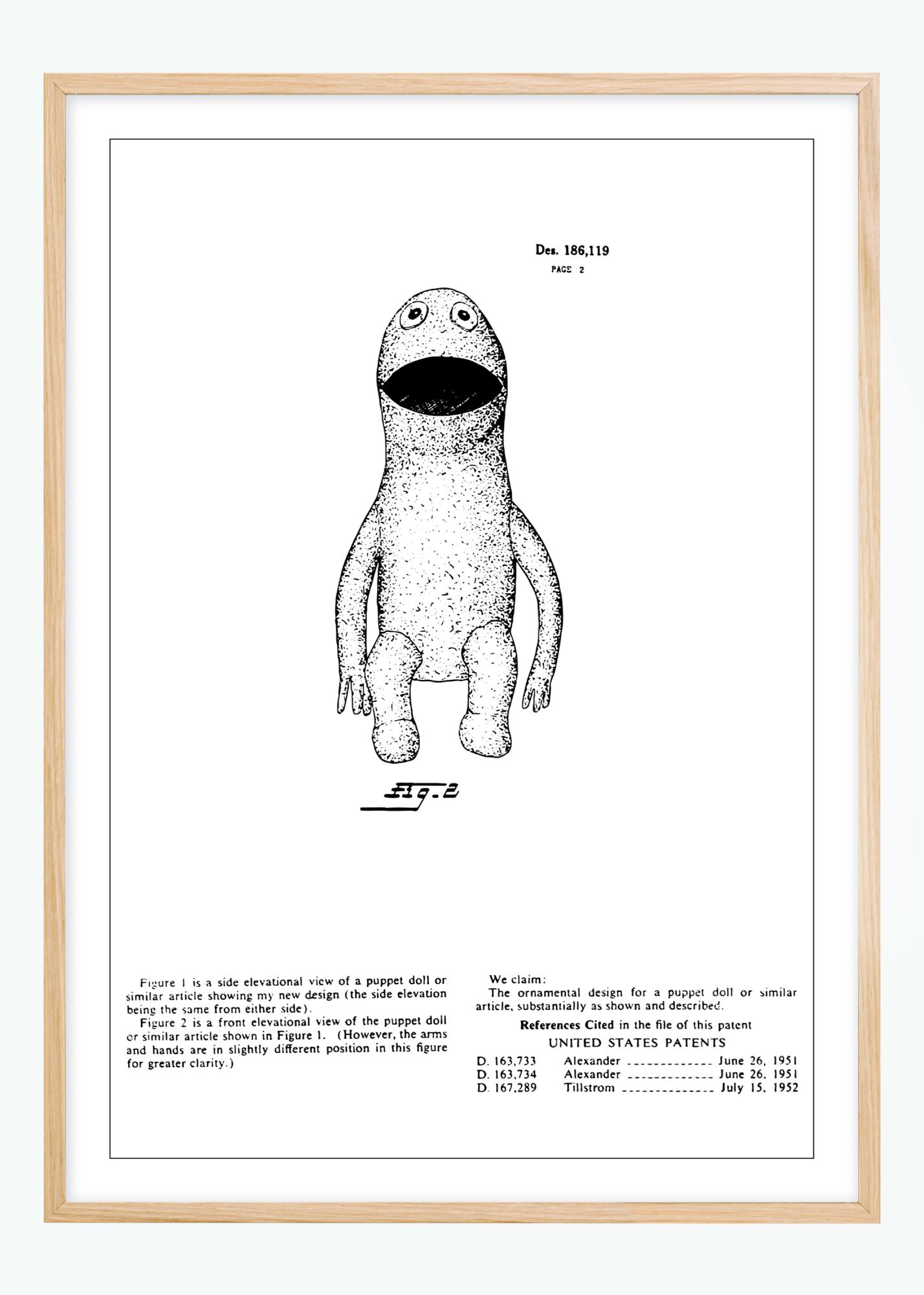 Questo poster di brevetto raffigura un giocattolo di Kermit. Con il numero di brevetto Des. 186,119, questa illustrazione è una documentazione ufficiale di una bambola con un'estetica affascinante e insolita. La figura nel disegno offre una vista frontale completa, che mette in evidenza i dettagli e la forma della bambola, e trasmette una sensazione di carattere e personalità che può essere apprezzata sia dai bambini che dagli adulti.