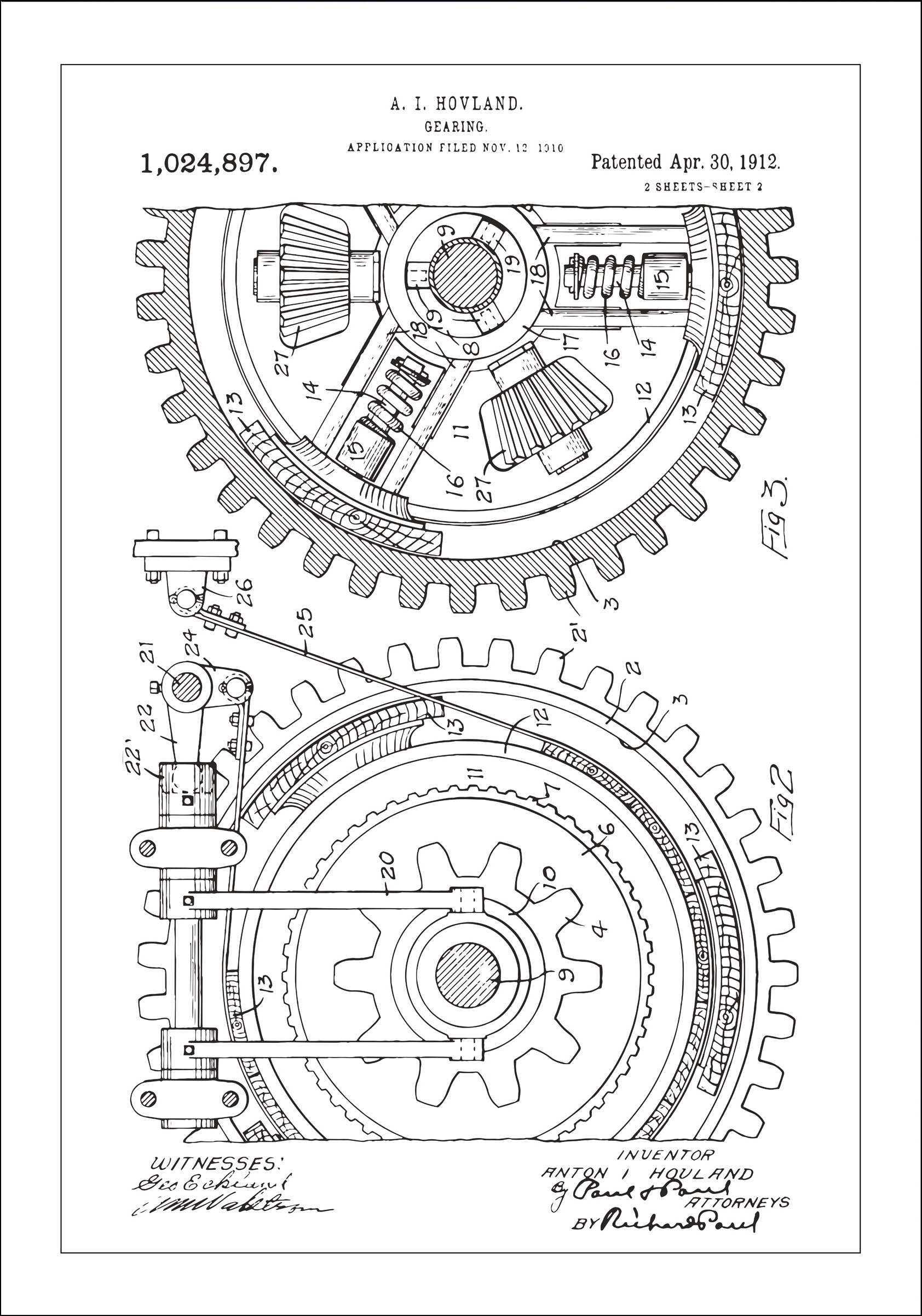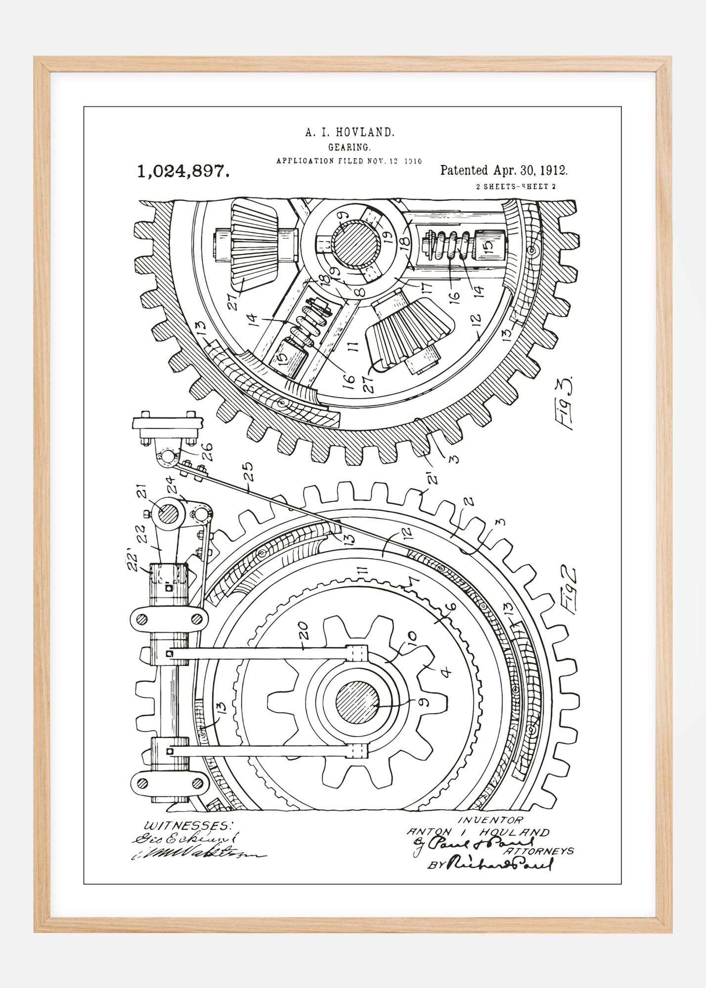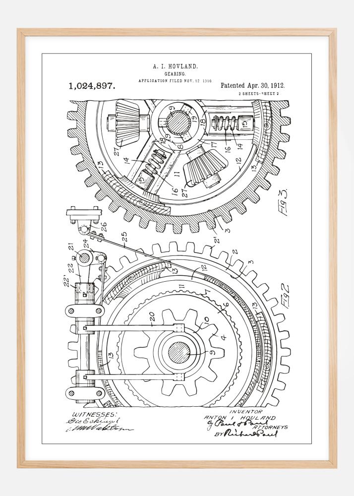 Decora la tua parete con questo classico poster di brevetto che presenta il complesso design del cambio di A. I. Hovland, numero di brevetto 1,024,897, concesso il 30 aprile 1912. Questo disegno dettagliato mette in evidenza l'abilità tecnica e la complessità delle prime costruzioni meccaniche. Le linee elaborate e i dettagli accurati di questo disegno di brevetto offrono una comprensione più profonda della storia dell'ingegneria e sono un maestoso complemento a ogni stile di arredamento tecnico o industriale.