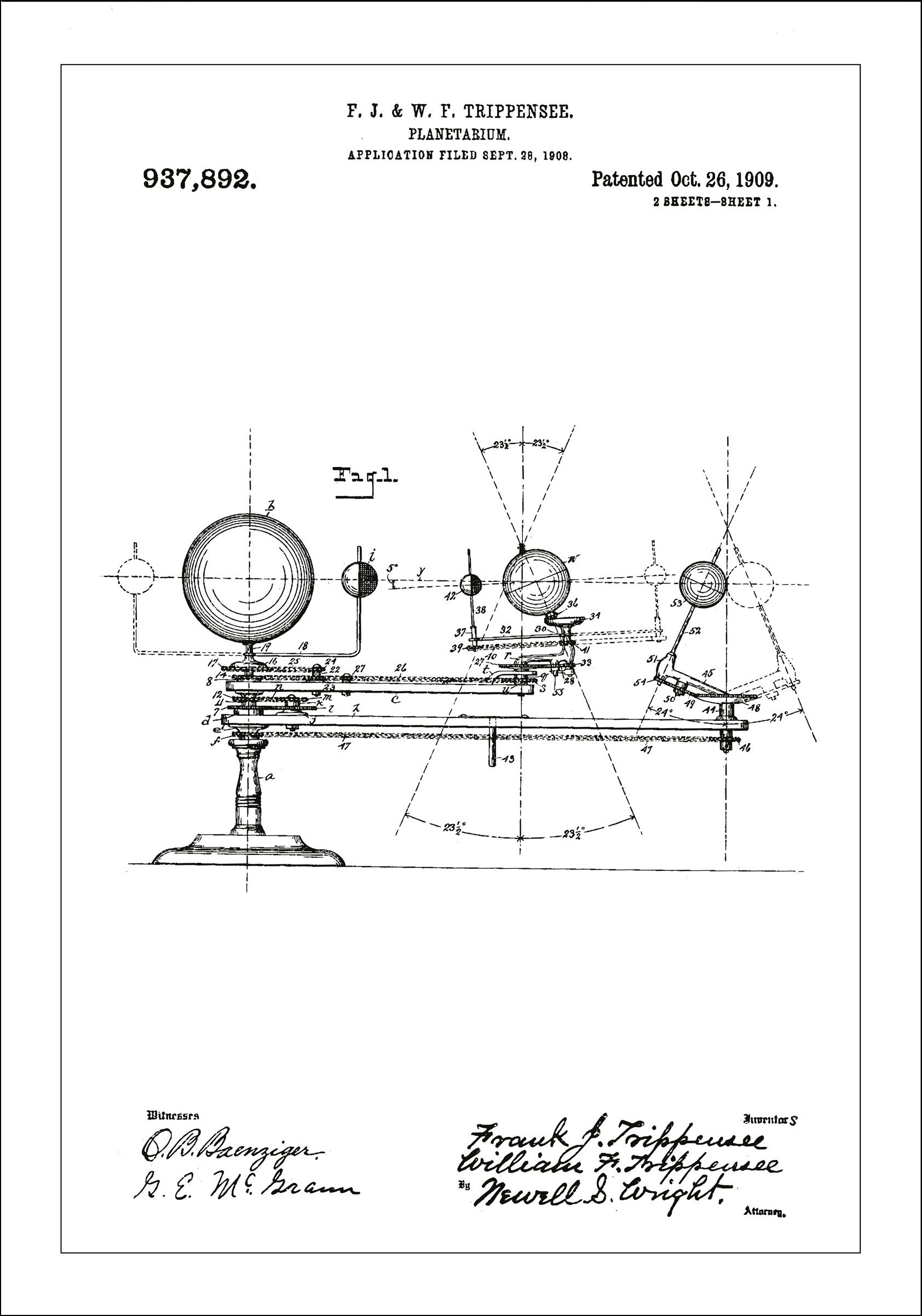 Questo elegante poster di brevetto è un omaggio all'ingegneria e allo studio dei corpi celesti, con una rappresentazione dettagliata del planetario di F. J. & W. F. Trippensee, un'invenzione classica del primo Novecento. Il brevetto, numero 937,892, è stato registrato il 26 ottobre 1909, e la domanda è stata presentata il 28 settembre 1908. Questo documento di brevetto artisticamente rappresentato è un elemento d'arredo unico che offre sia una lezione di storia che un argomento di conversazione. È ideale per gli appassionati di scienze o per dare un tocco accademico alla casa, all'ufficio o all'aula.