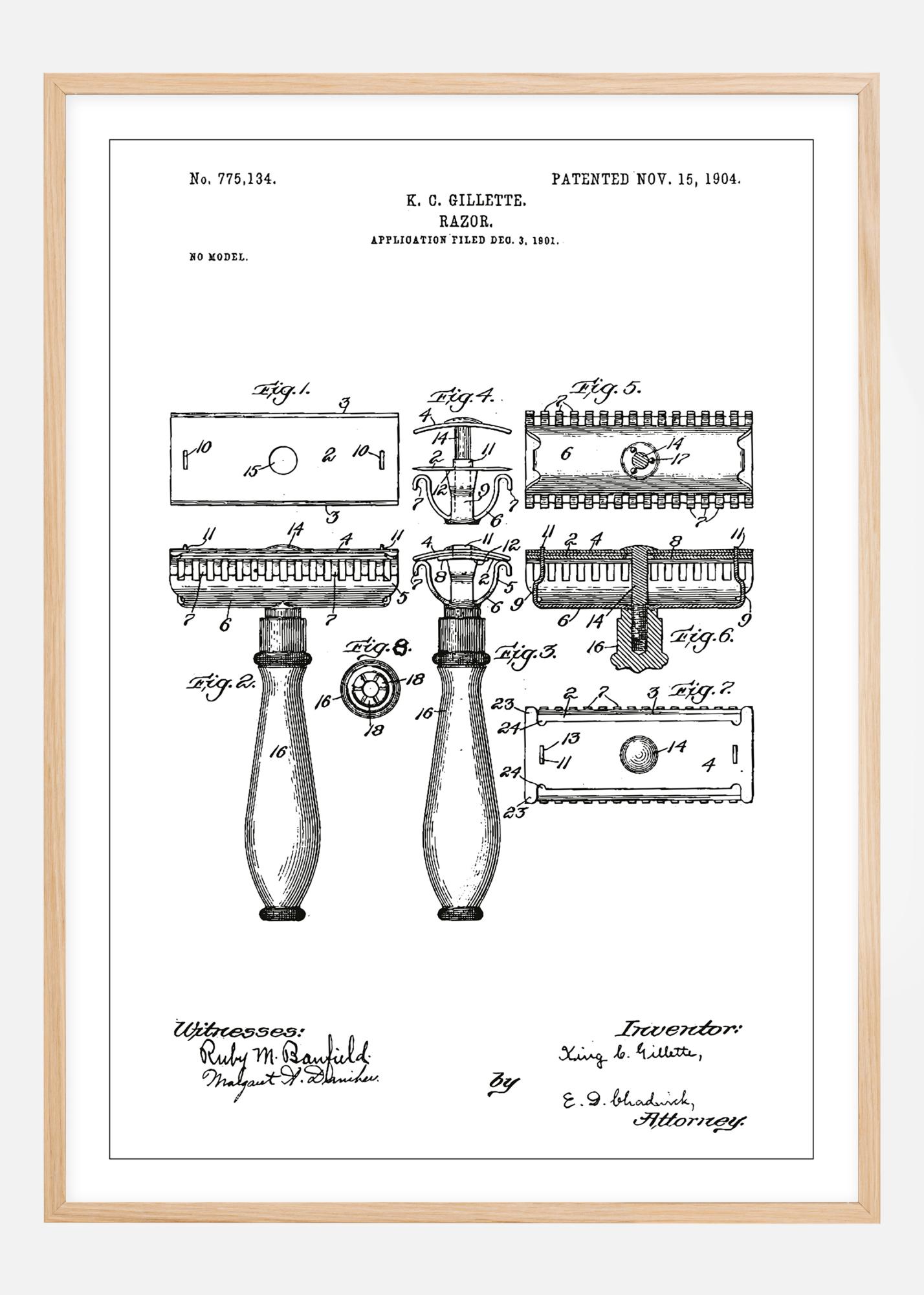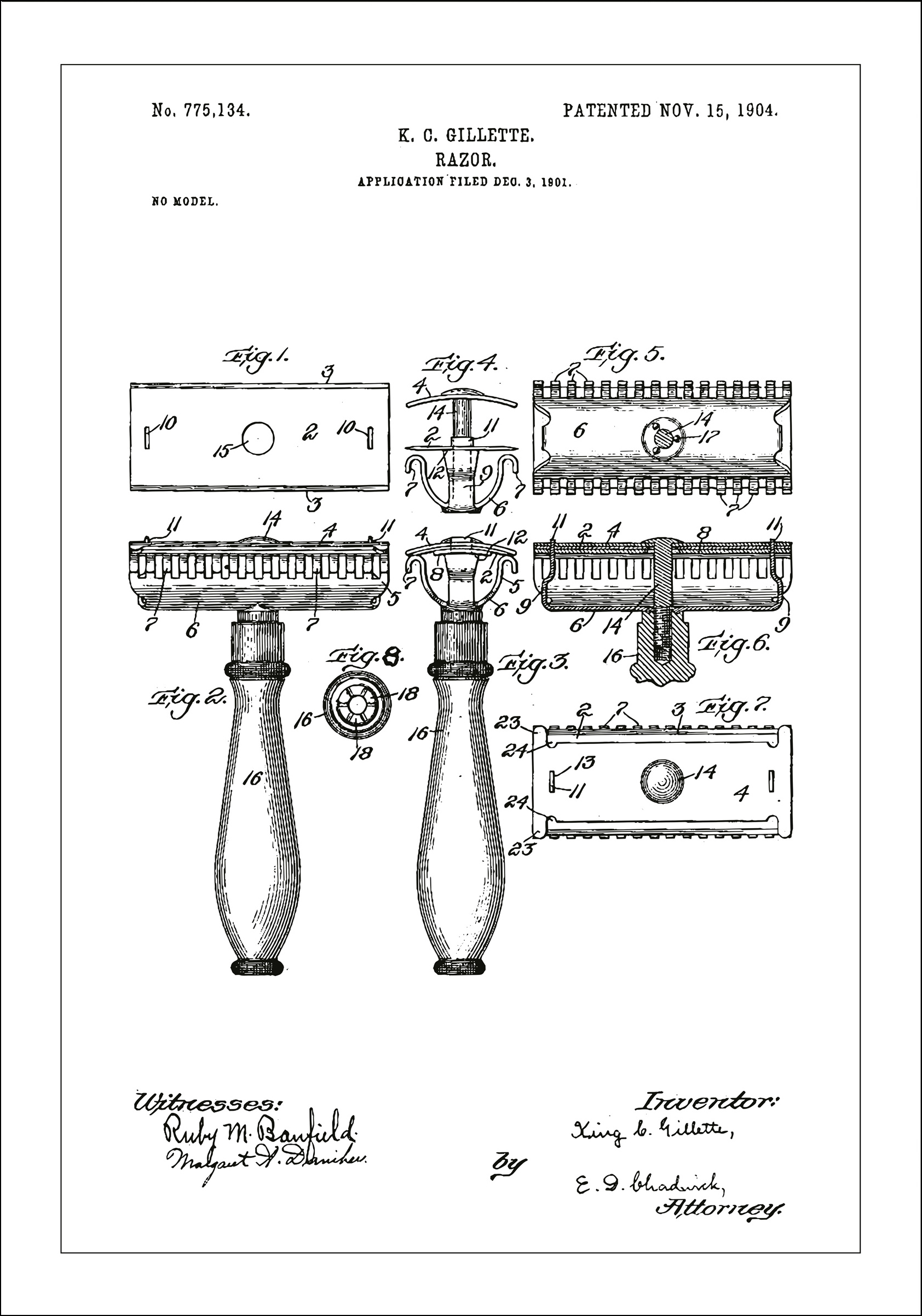 Con un design iconico ed elegante, questo poster di brevetto presenta la rivoluzionaria creazione di K.G. Gillette: il rasoio, brevettato il 15 novembre 1904, numero di brevetto 775,134. I dettagli di questo disegno di brevetto evidenziano gli aspetti meccanici e la costruzione innovativa che hanno cambiato per sempre l'igiene personale, e questo è stato documentato per la prima volta nel dicembre 1901.