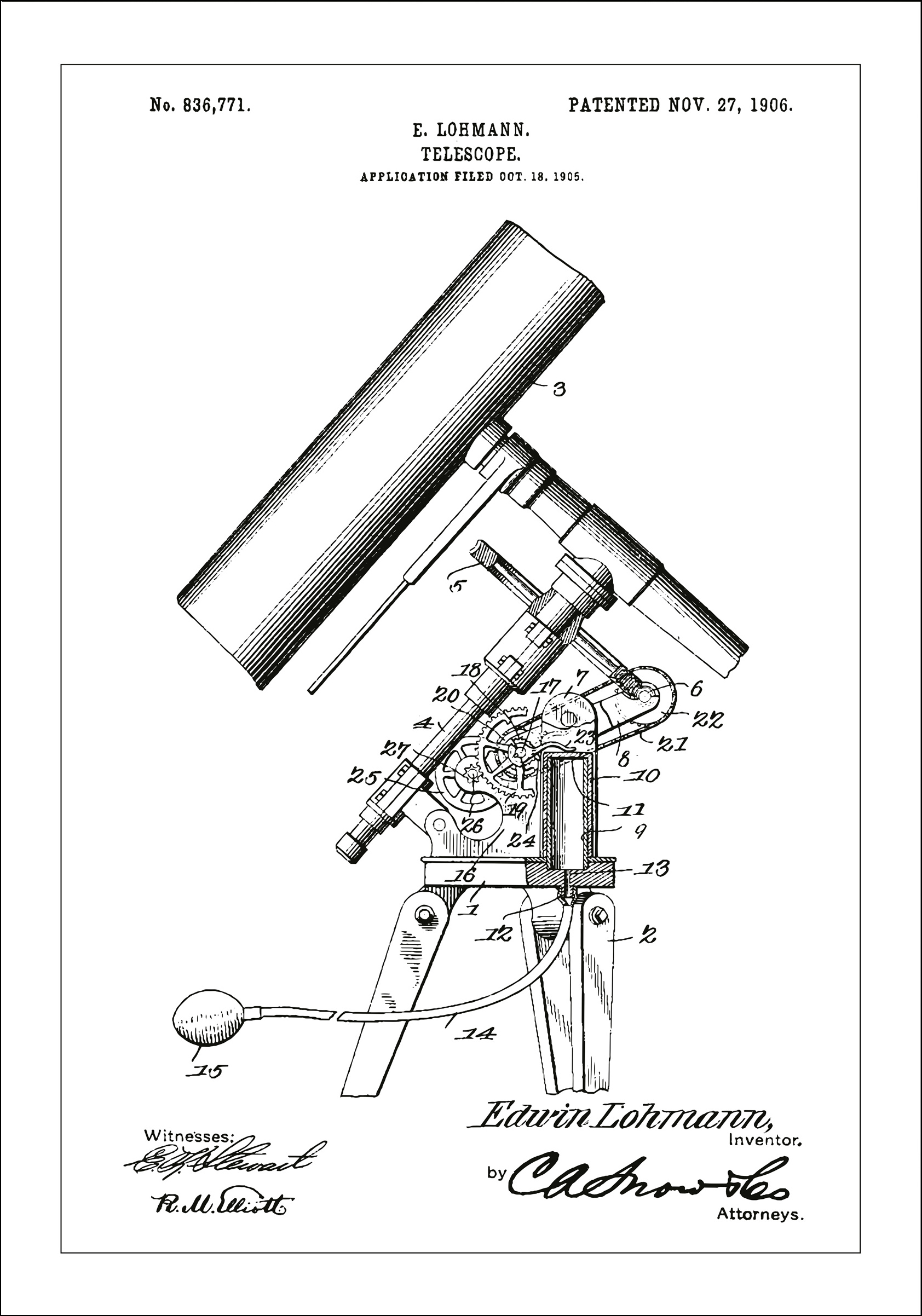 Questo poster di brevetto illustra un design magistrale di un telescopio, un'invenzione di E. Lohmann brevettata il 27 novembre 1906 sotto il numero 836,771. La ricchezza di dettagli nel disegno mette in risalto i componenti tecnici e la complessità meccanica di questo strumento ottico. L'illustrazione in bianco e nero sulla sfondo nero offre un forte contrasto visivo che esalta l'eleganza tecnica del design di Lohmann, rendendolo un ambito elemento decorativo per tutti gli appassionati di scienze e astronomia.