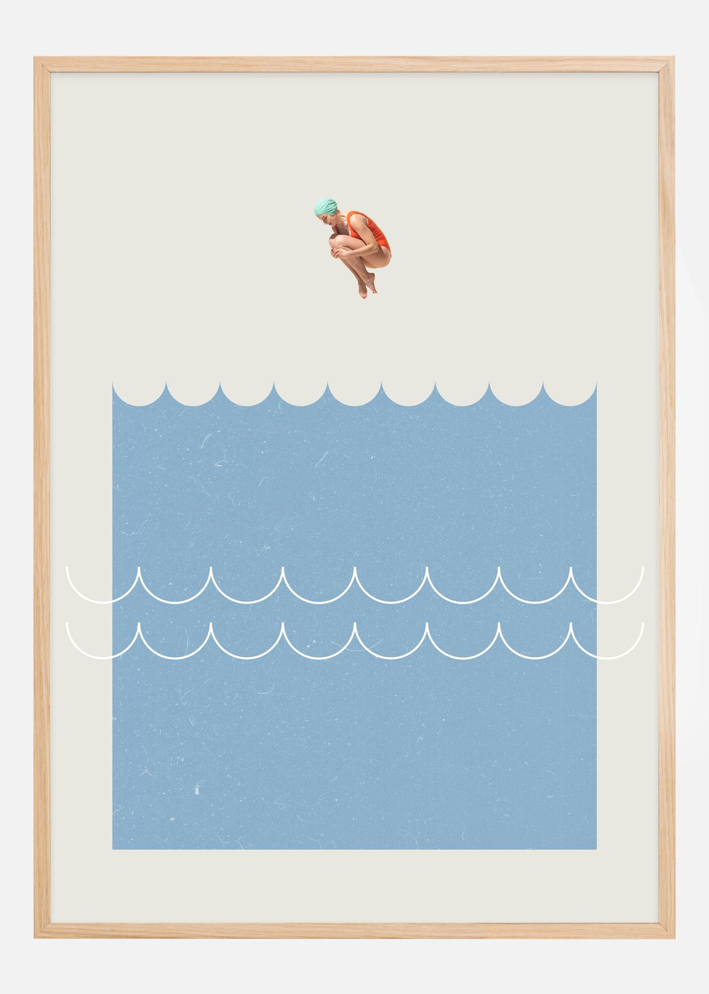 Questo poster è un'interpretazione giocosa di uno schizzo estivo, dove una piccola figura in costume da bagno e cuffia da nuoto è visibile in caduta libera verso un'illustrazione stilizzata di onde. Il design minimalista combina realtà con astrazione, offrendo una prospettiva creativa e rinfrescante sul classico tema del periodo estivo e del piacere del bagno.