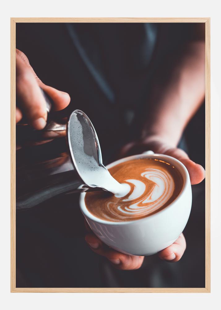 Questo poster cattura l'essenza del paradiso degli amanti del caffè con un'immagine ravvicinata di mani che creano il cappuccino perfetto. Il soggetto mostra l'artista dietro il bancone del caffè in una quasi danzante sincronia mentre il latte viene versato con cura per formare un delizioso motivo a cuore nella schiuma. Lo sfondo scuro del poster enfatizza i toni caldi del caffè e la superficie scintillante del latte ricco, invitando a una sensazione di comfort e piacere.