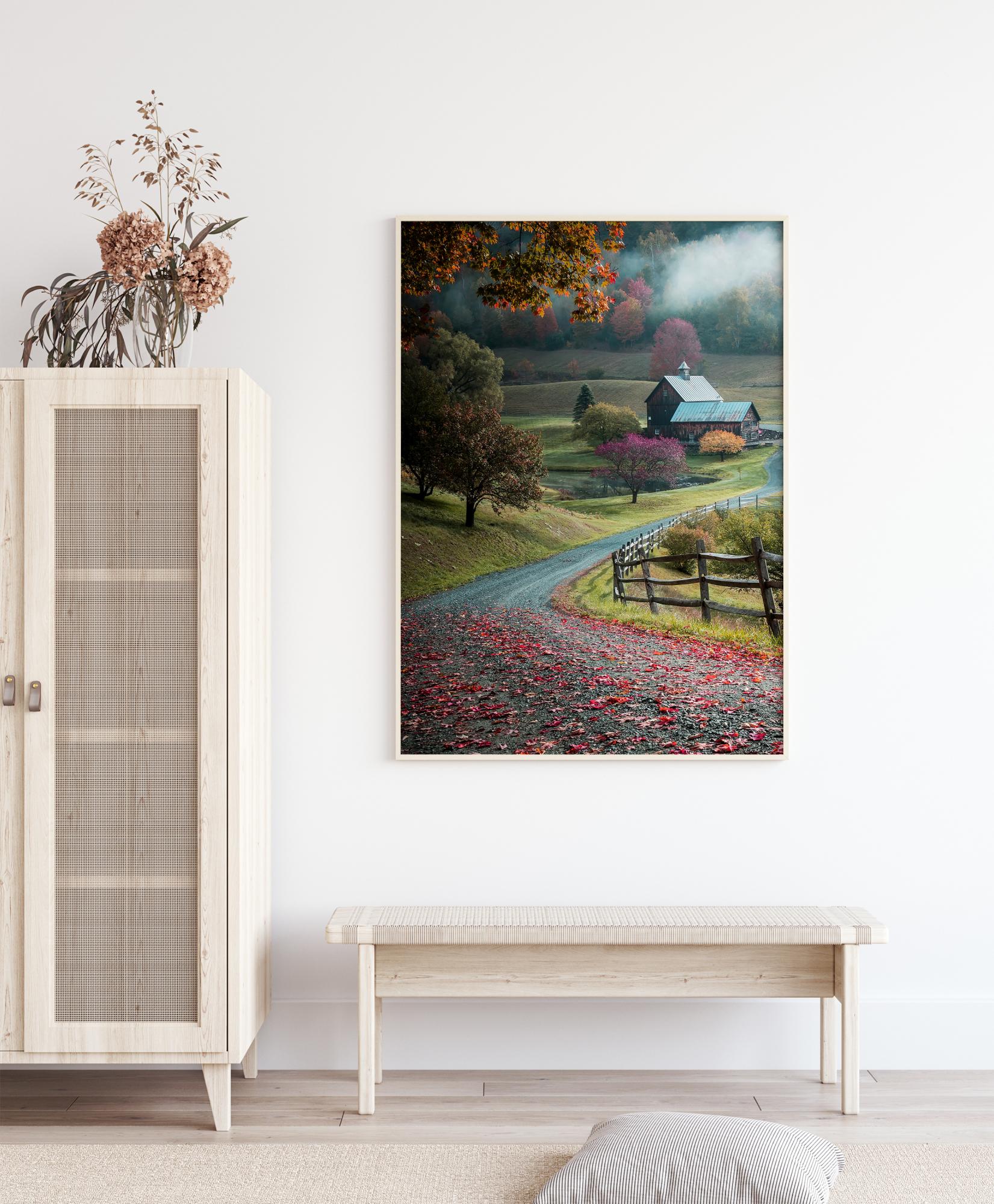 Un poster naturale con una campagna con una piccola strada per auto, una fattoria idilliaca e alberi autunnali. Le foglie rosse giacciono sulla strada che porta a una valle e alla piccola casa. Un raggio di sole si fa strada nella valle e illumina le foglie autunnali dell'albero. Senti il fascino della campagna quando appendi questa immagine a casa tua.