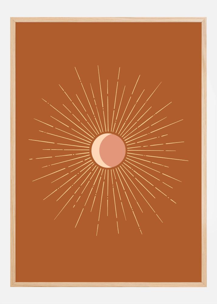 Questo poster minimalista ed elegantemente progettato con un'eclissi solare astratta diventa un accento elegante e moderno su qualsiasi parete. Con le sue linee pulite e il motivo radiante su uno sfondo terracotta profondo, questa stampa rappresenta una perfetta fusione di semplicità e sofisticazione. L'elemento centrale del design, un cerchio con un'esplosione di linee, simboleggia luce ed energia, e aggiunge un effetto dinamico nella stanza.