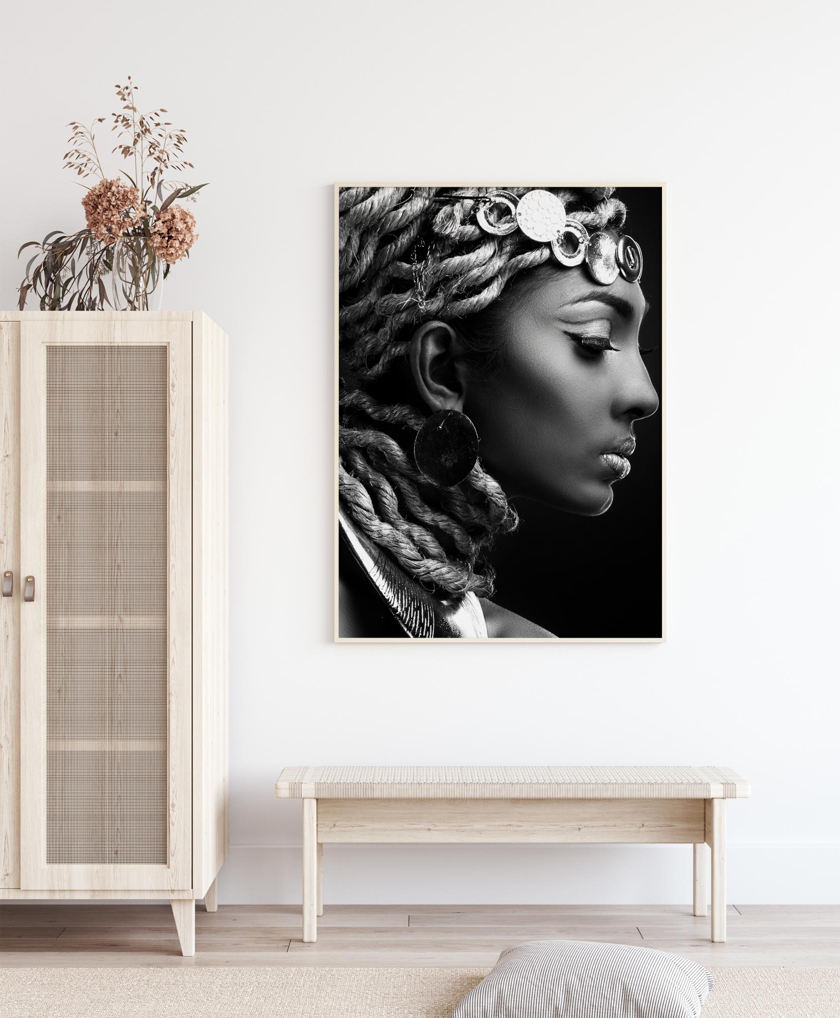 Un fantastico poster ritratto con il profilo di una donna vestita in stile antico egiziano. Questa immagine in bianco e nero crea una sensazione di dramma poiché questa bellissima donna guarda con arroganza verso il basso. La sua testa, le orecchie e il collo sono coperti da grandi gioielli dorati, simbolo di ricchezza. Ispirati ogni giorno da questa donna forte.
