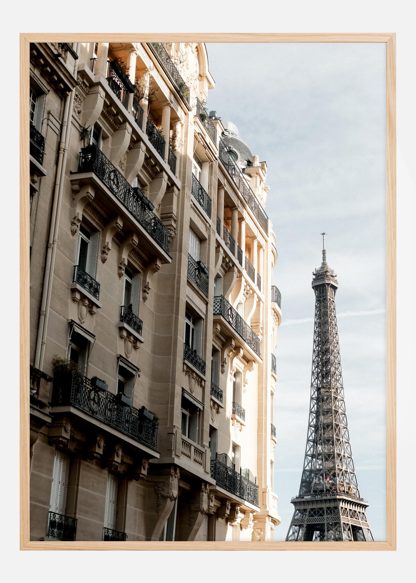 Questo poster ritrae una vista classica di Parigi dove la Torre Eiffel si erge orgogliosamente dietro le tipiche abitazioni cittadine con i loro balconi in ferro battuto e dettagli scultorei sulla facciata. È una scena che emana un'atmosfera parigina ed eleganza, perfetta per aggiungere un tocco di fascino francese a qualsiasi casa. L'immagine cattura il perfetto equilibrio tra le perle architettoniche cittadine e lo spazio aperto del cielo, offrendo una sensazione di spazio e libertà che è sinonimo dell'anima di Parigi.
