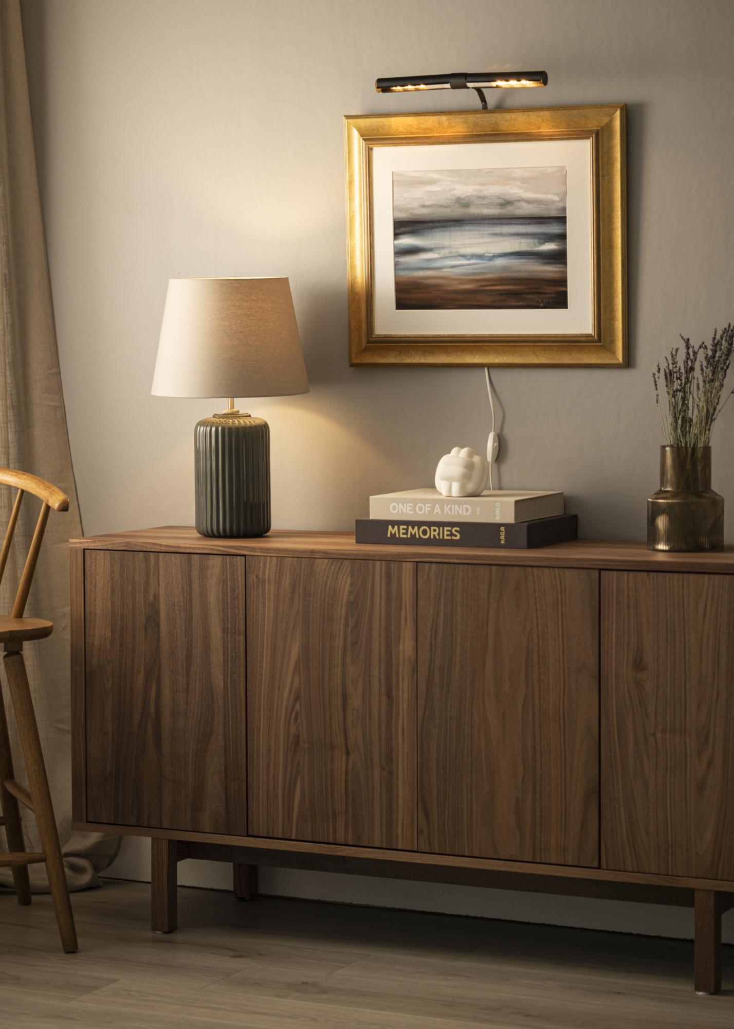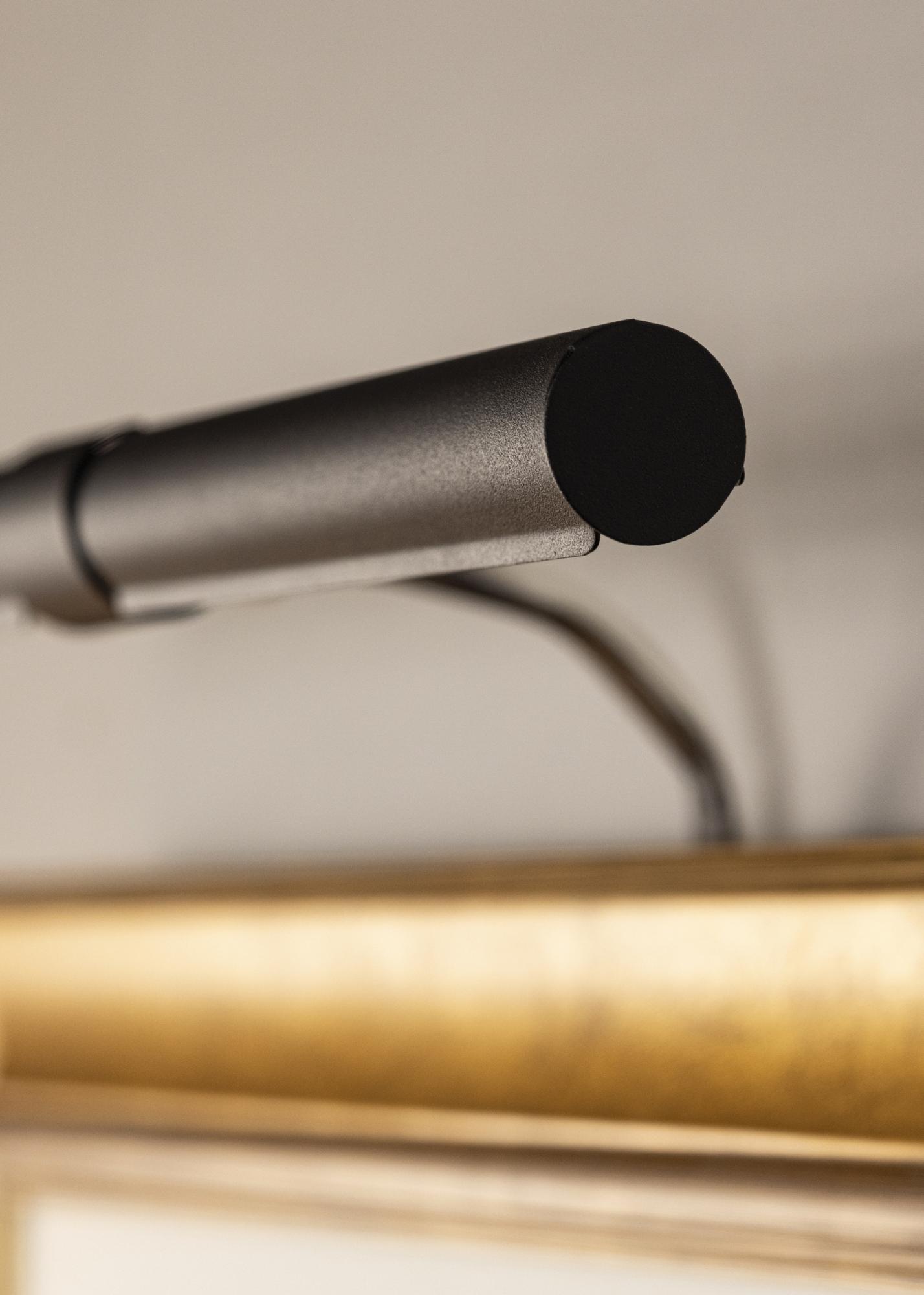 Di solito si fissa la lampada per quadri sul retro della cornice, lo svantaggio è che è necessaria una cornice di legno (anche alcune cornici composite vanno bene) con un profilo largo per poter essere avvitata alla cornice. Con il nostro supporto da parete non devi pensarci, ma puoi semplicemente montare la tua lampada per quadri direttamente sul muro dietro al quadro.