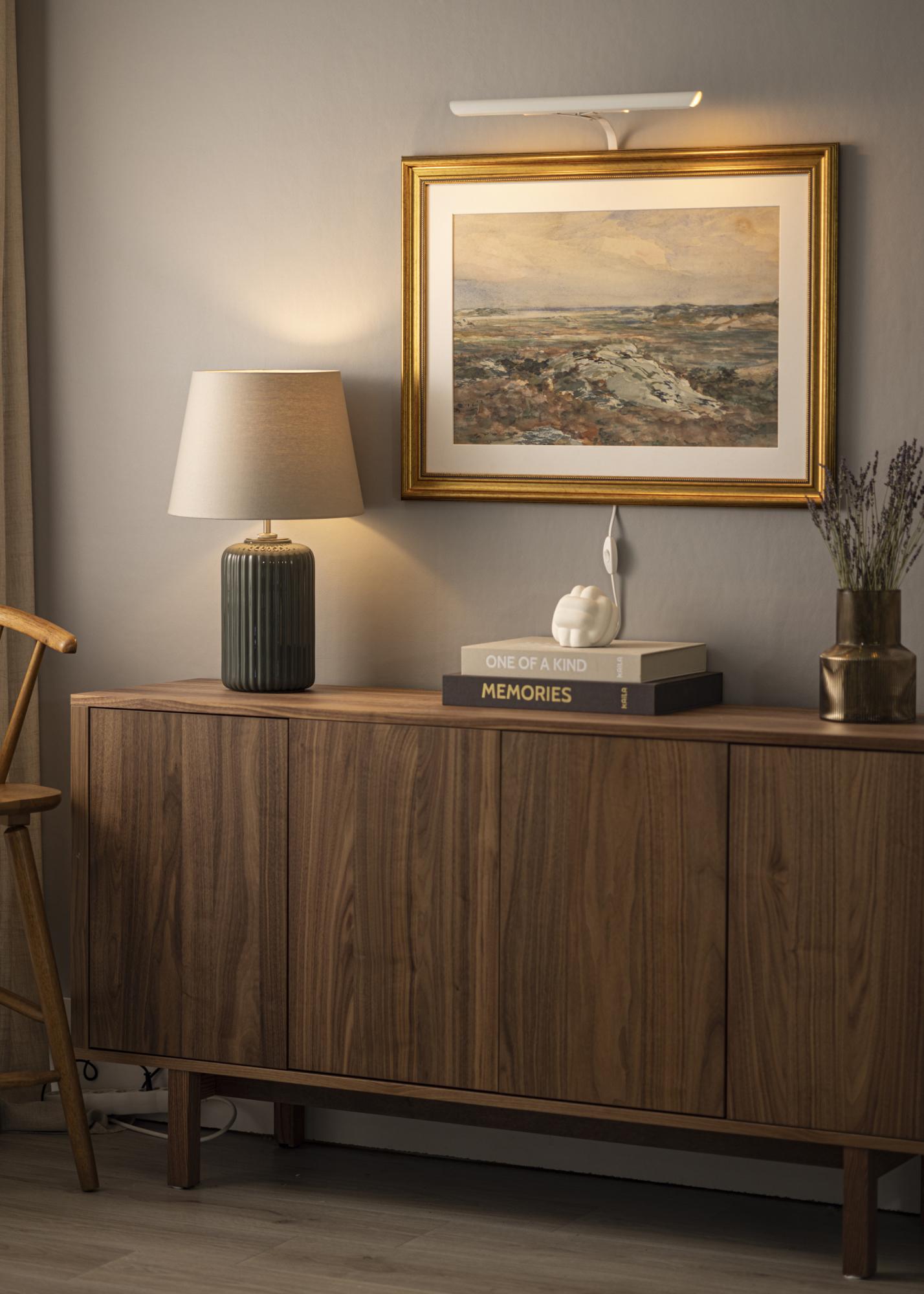 Normalmente si fissa l'illuminazione per quadri sul retro della cornice, lo svantaggio è che è necessaria una cornice di legno (anche alcune cornici composite vanno bene) con un profilo largo per poter avvitare sulla cornice. Con il nostro supporto da parete non devi pensarci, ma puoi semplicemente montare l'illuminazione per quadri direttamente sul muro dietro il quadro.