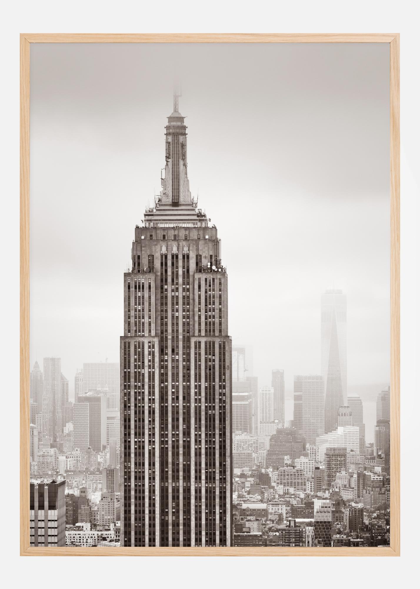 Un poster urbano con l'Empire State Building a New York. L'Empire State Building è il punto focale qui, con New York sullo sfondo. Il resto della città è parzialmente nascosto dalla nebbia, il che fa risaltare chiaramente i dettagli di questo grattacielo. Immagina che questa sia la tua vista quando appendi questo nella tua casa.