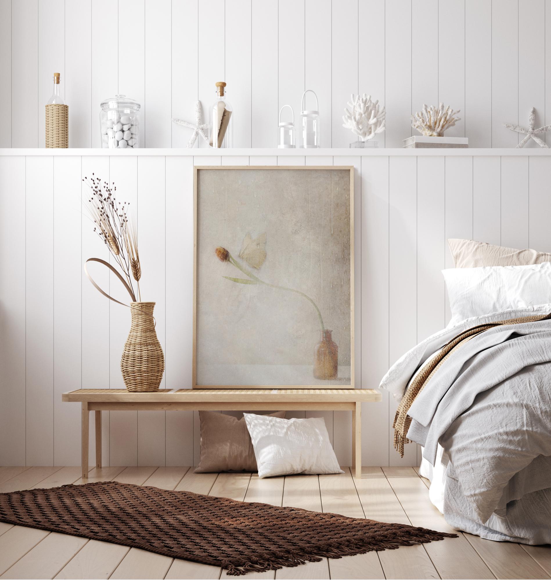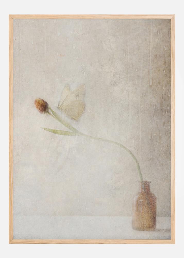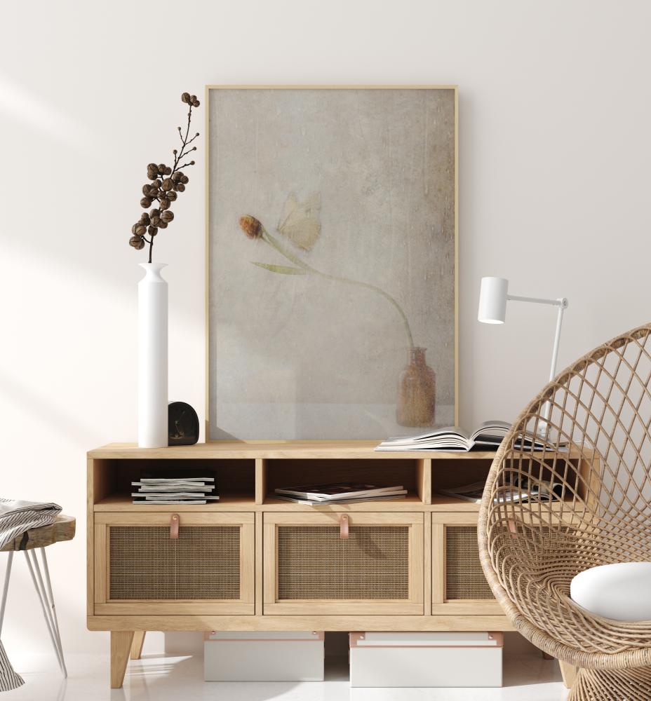 Un poster discreto con una farfalla che si posa su un fiore. Questa immagine sottile con tonalità marroni dona calore alla stanza. La farfalla si posa delicatamente sul fiore che si piega verso il centro dell'immagine. Le ali si fondono quasi con la parete dietro in questo incontro fugace.