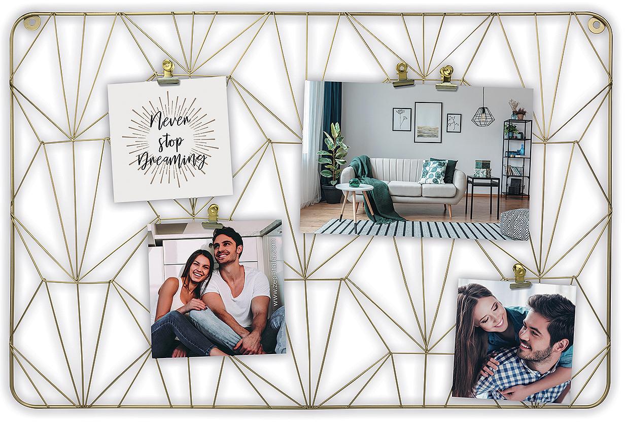 Cornice multipla progettata come una bacheca in cui attaccare le tue foto con clip. La cornice è realizzata in metallo e ha una tonalità dorata. Poiché attacchi le tue immagini in autonomia, puoi scegliere di mescolare foto di diverse dimensioni e anche esprimere la tua creatività attaccando ad esempio piccoli poster o biglietti! La cornice misura 62x41 cm nelle dimensioni esterne. Questa cornice trova posto sopra la scrivania, in cucina o in qualsiasi altro luogo in cui possa esprimere il suo valore decorativo e funzionale. Supporto da parete incluso.