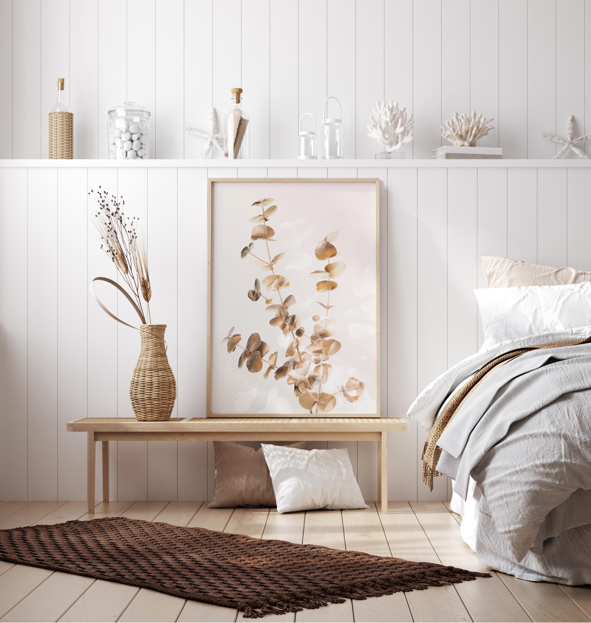 Un bellissimo poster con rami di eucalipto dorato. Le foglie dorate e marroni sono morbide mentre sporgono dallo sfondo bianco. Le foglie sono rotonde, creando belle forme nell'immagine. Questo poster dona una sensazione di tranquillità e stile alla tua casa.