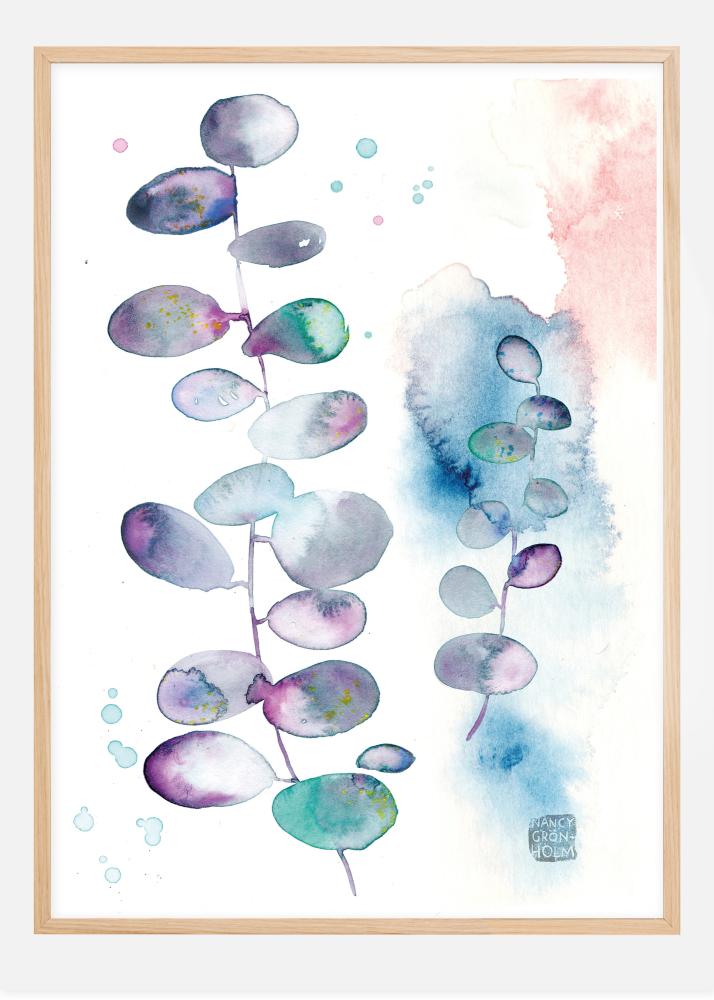 Un poster d'arte in acquerello raffigurante un eucalipto nei toni del rosa, viola, blu e verde, creato dall'artista Nancy Verdeholm, Green Isle Studio. Un poster elegante e raffinato che può essere abbinato ad altre opere dello stesso studio per creare un collage più grande sullo stesso tema.