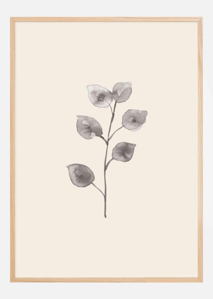 Un elegante poster con una semplice pittura di un ramo di eucalipto. Le foglie sono realizzate in stile acquerello, in modo che siano morbide e i bordi siano quasi sfumati. In una tonalità grigia semplice, le foglie spiccano sullo sfondo bianco. Appendila a una parete verde per aggiungere colore.