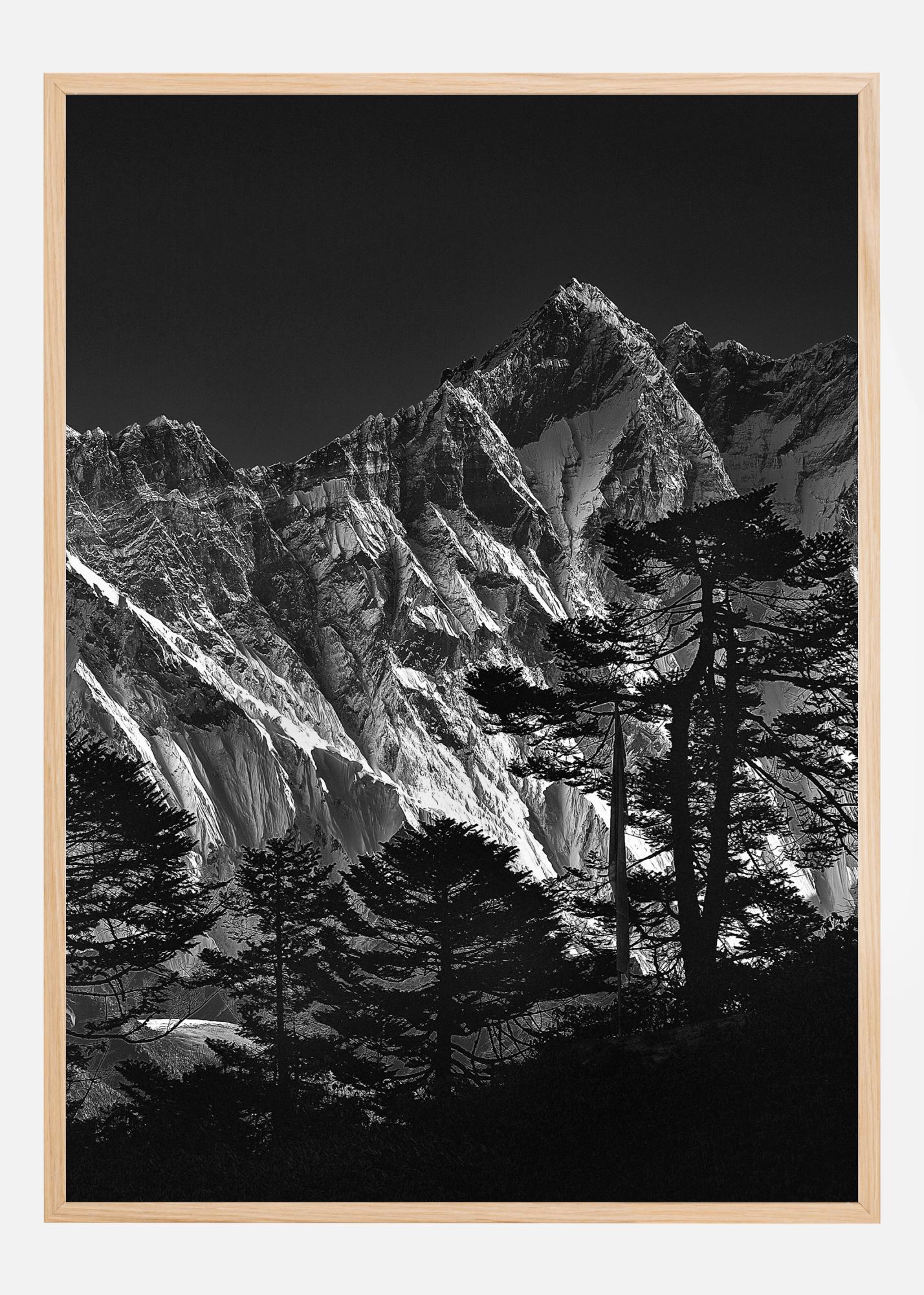 Una foto di montagna che mostra un lato dell'Everest. Questa foto in bianco e nero drammatica mostra i lati puri della montagna in una luce nitida. Alberi scuri si trovano in primo piano e un cielo scuro circonda la montagna sullo sfondo. Senti il dramma e il pericolo in questa immagine.