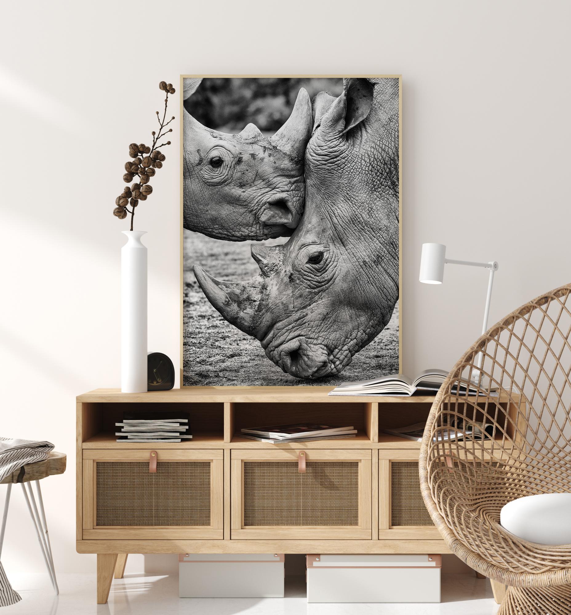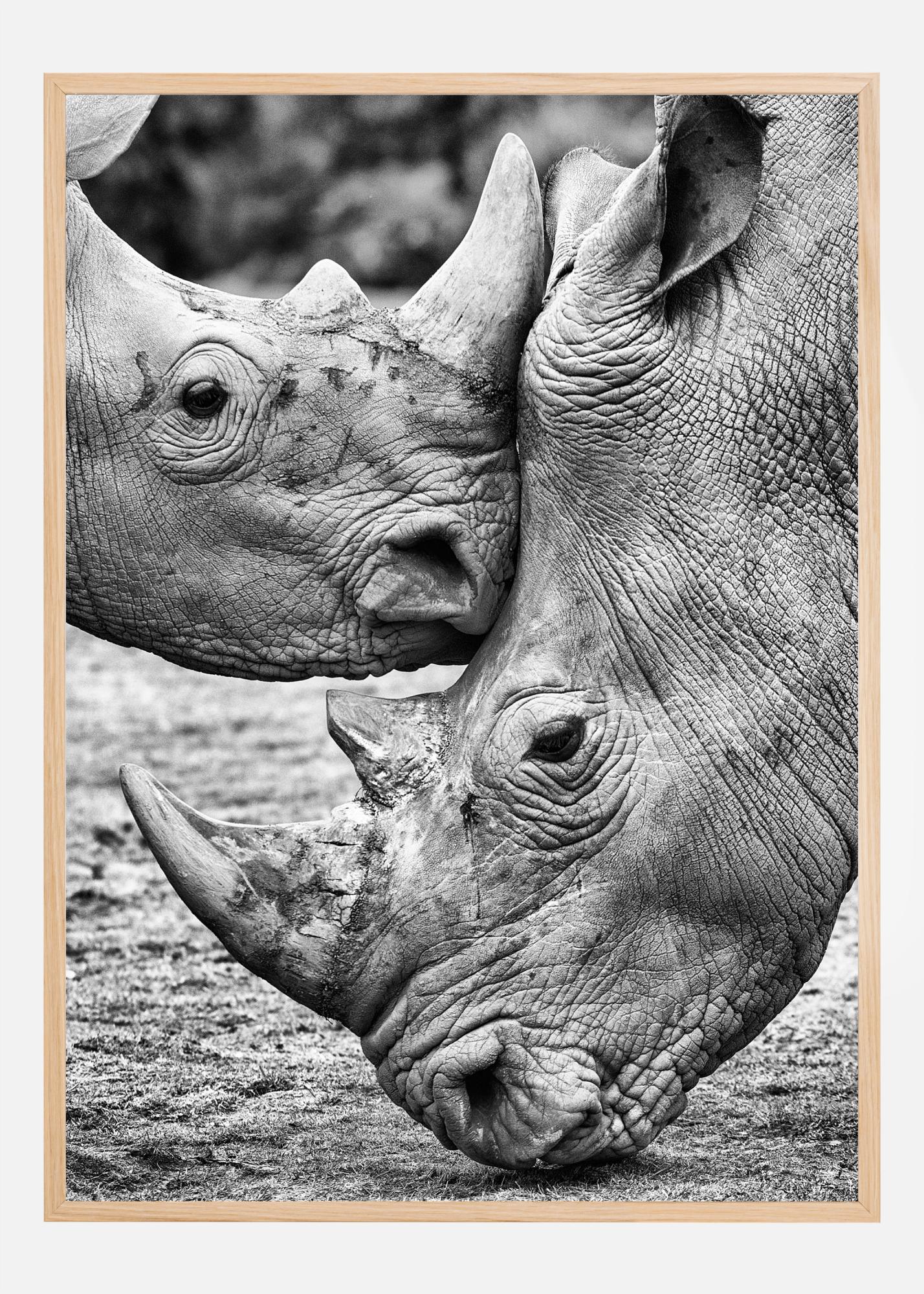 Un poster maestoso con due rinoceronti che si trovano faccia a faccia. Porta il rispetto e la meraviglia della natura nella tua casa con questa fantastica stampa. Senti e goditi la tranquillità con questo poster.