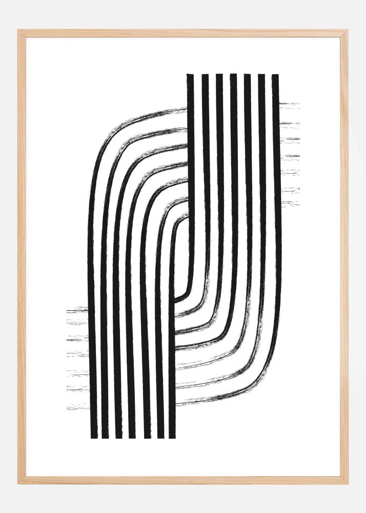 Un semplice poster con linee nere che creano un motivo. L'immagine è composta da sette linee nere che salgono dritte, si piegano e sbiadiscono. Un secondo set di linee riflette il primo ma va nella direzione opposta. Trasforma la tua casa in una galleria con questa opera sperimentale.