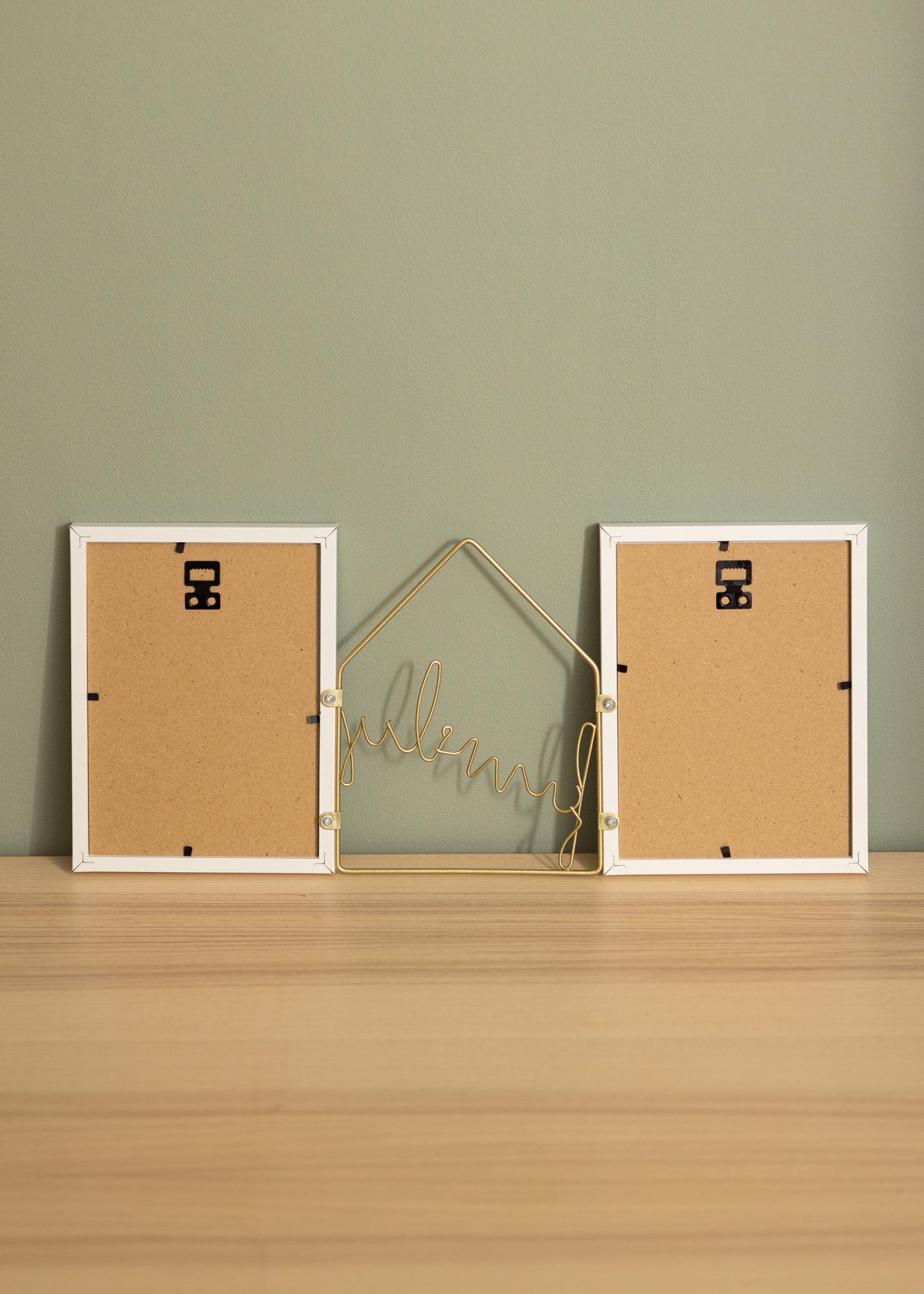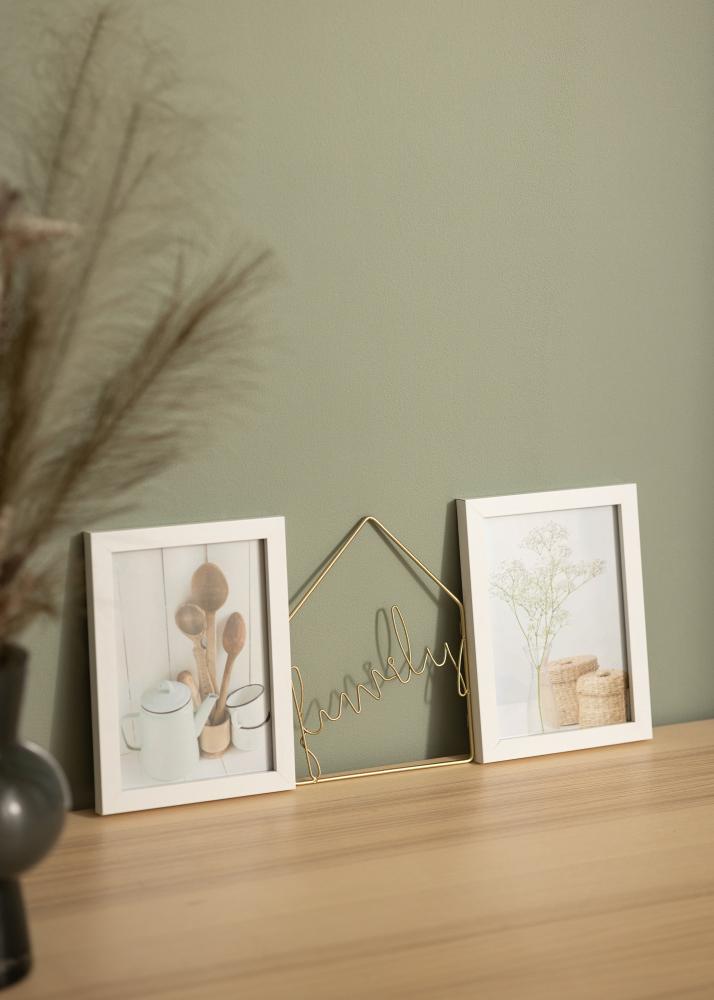 Vuoi avere una cornice decorativa per 2 foto di dimensioni 13x18 cm? Allora questa è la cornice giusta per te. Questa bella cornice a collage ha un design unico, con due cornici bianche che si trovano tra il testo "family" scritto in filo di metallo dorato. Il filo di metallo forma anche il contorno di una casa, che enfatizza l'espressione familiare della cornice.