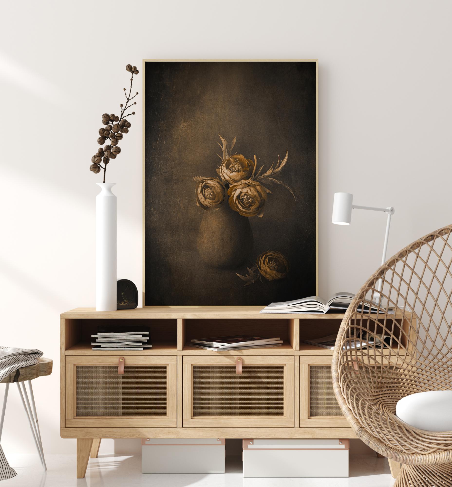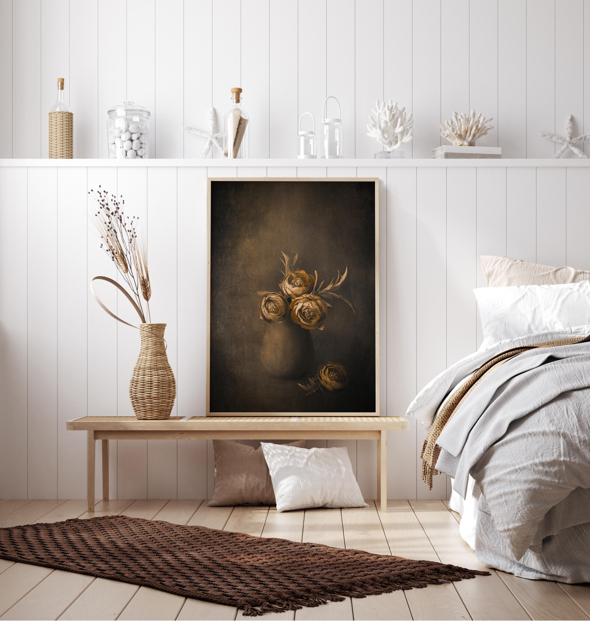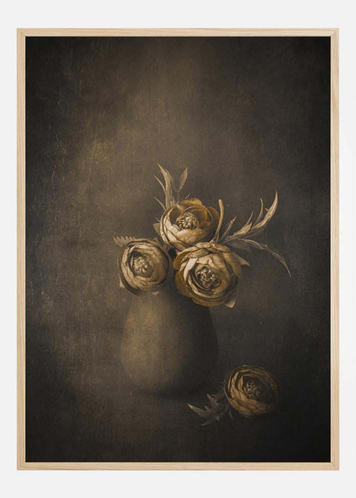 Un poster di natura morta con fiori dorati in un vaso di argilla su uno sfondo scuro. I fiori dorati brillanti spiccano sul muro marrone più scuro nella pittura. Abbinare questo con una parete color crema per elevare i fiori al livello successivo.