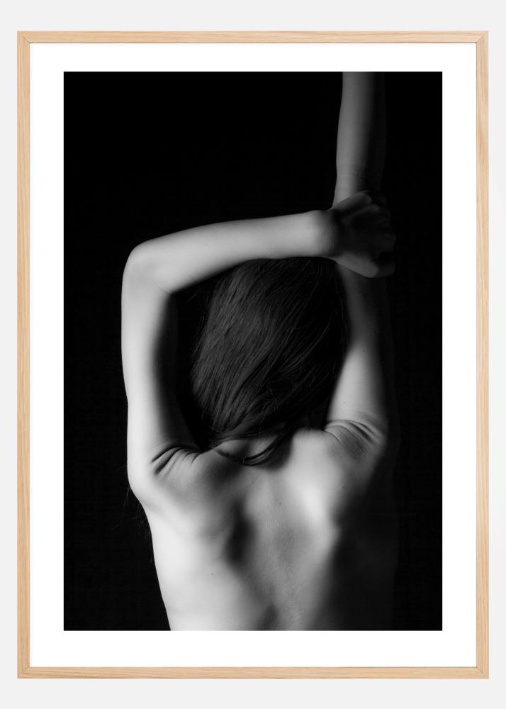 Un poster ritraente la schiena di una donna. Questa immagine in bianco e nero mette in evidenza i muscoli della schiena mentre solleva un braccio in alto e piega l'altro sopra la testa. Parti di lei sono avvolte nell'ombra. Appendi questa opera a casa per dare un tocco artistico.