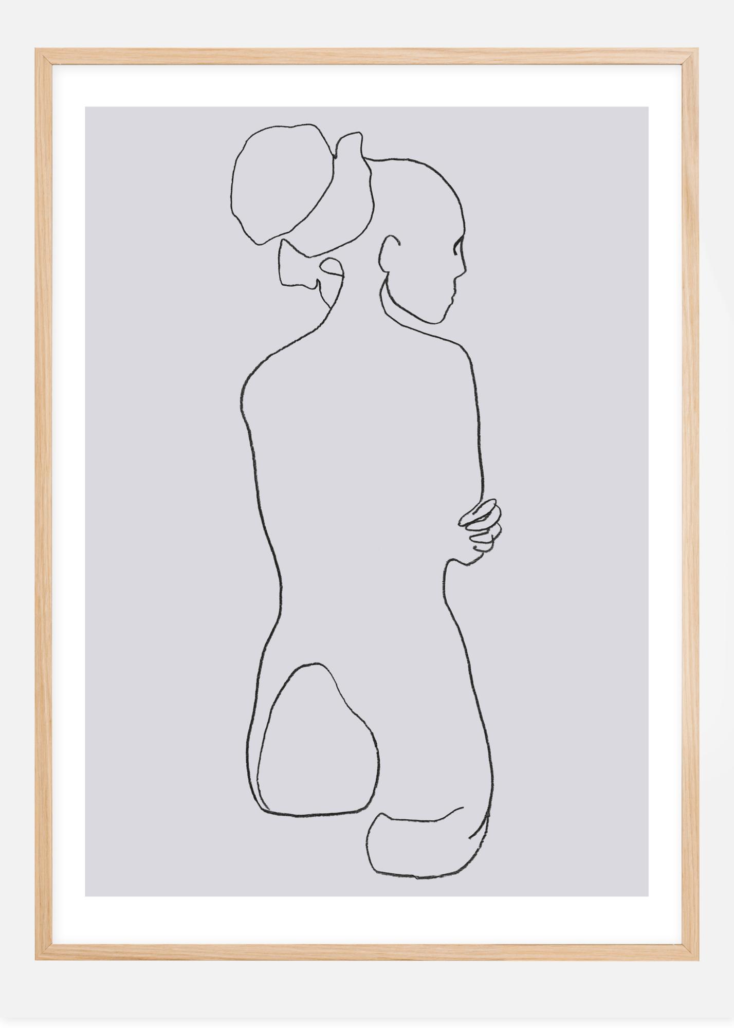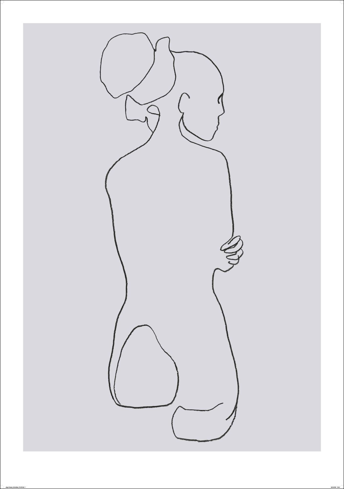 Un'arte lineare elegante che raffigura la schiena nuda di una donna con i capelli raccolti, creata dall'artista Jörgen Hansson su Jörgen Hansson Art. Un poster dallo stile pulito che può essere combinato con le opere di Jörgen Hansson Female Lines II e Female Lines III.