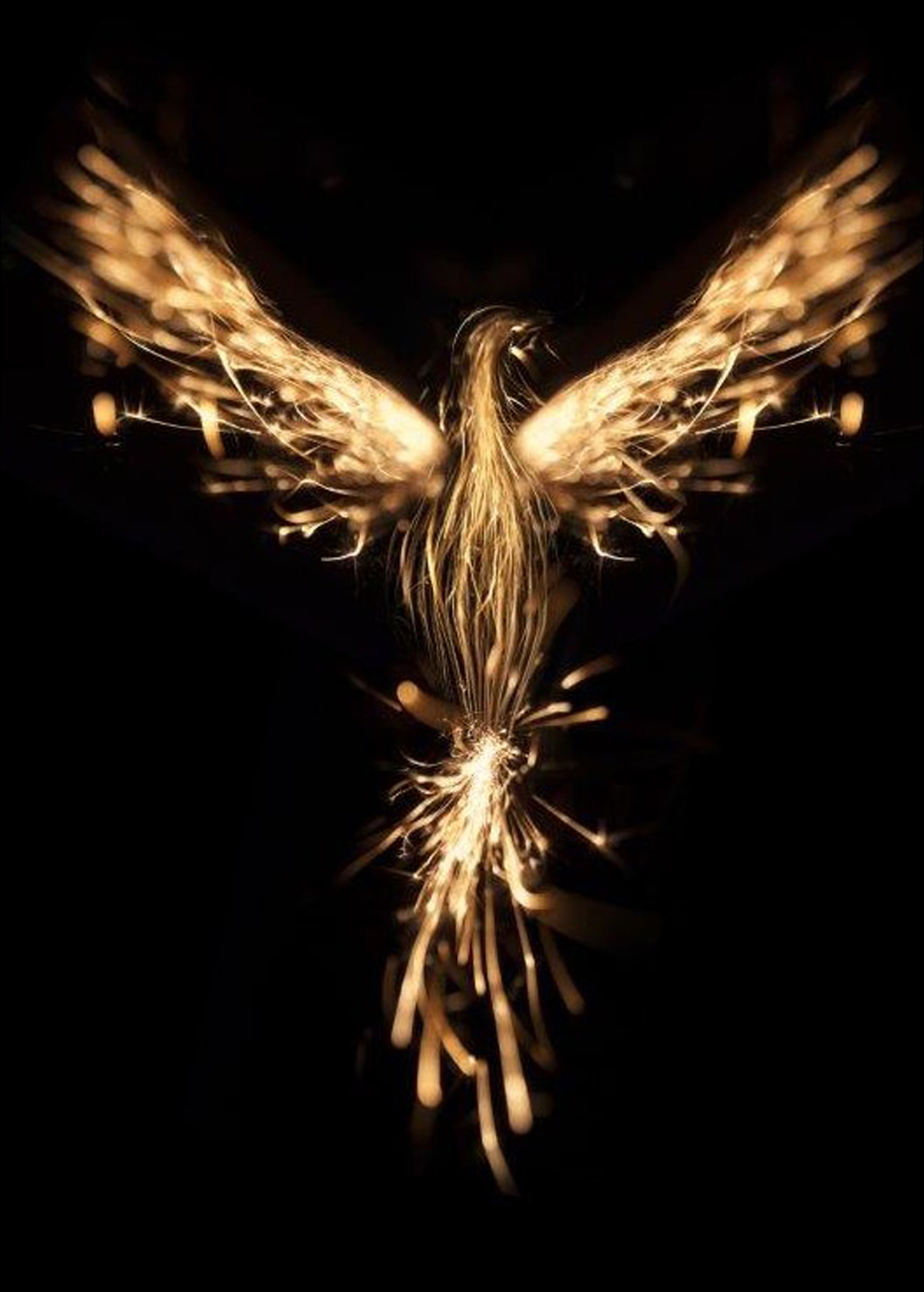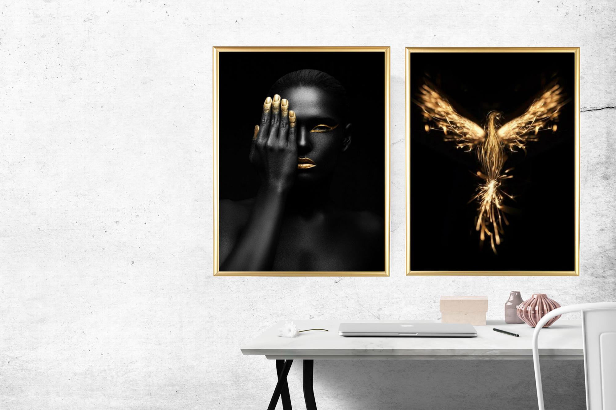 Attraverso l'arte grafica, la Fenice prende forma in un fuoco d'artificio di tonalità dorate su uno sfondo nero. Un poster caldo e piacevole in un formato minimalista, perfetto da abbinare ad altri preferiti in un collage più grande.