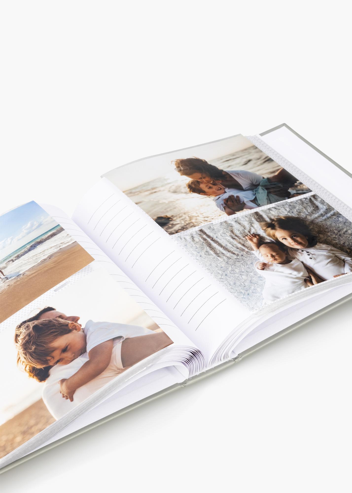 Le copertine dell'album sono rivestite in un colore grigio senza tempo che si adatta a tutte le case e stili di arredamento. Le pagine bianche offrono uno sfondo pulito e fresco per le tue fotografie, mentre l'orientamento orizzontale delle immagini esalta il fascino unico di ogni foto. Per ogni foto c'è inoltre uno spazio di scrittura adatto dove puoi annotare dettagli memorabili o date, rendendo l'album sia personale che informativo.