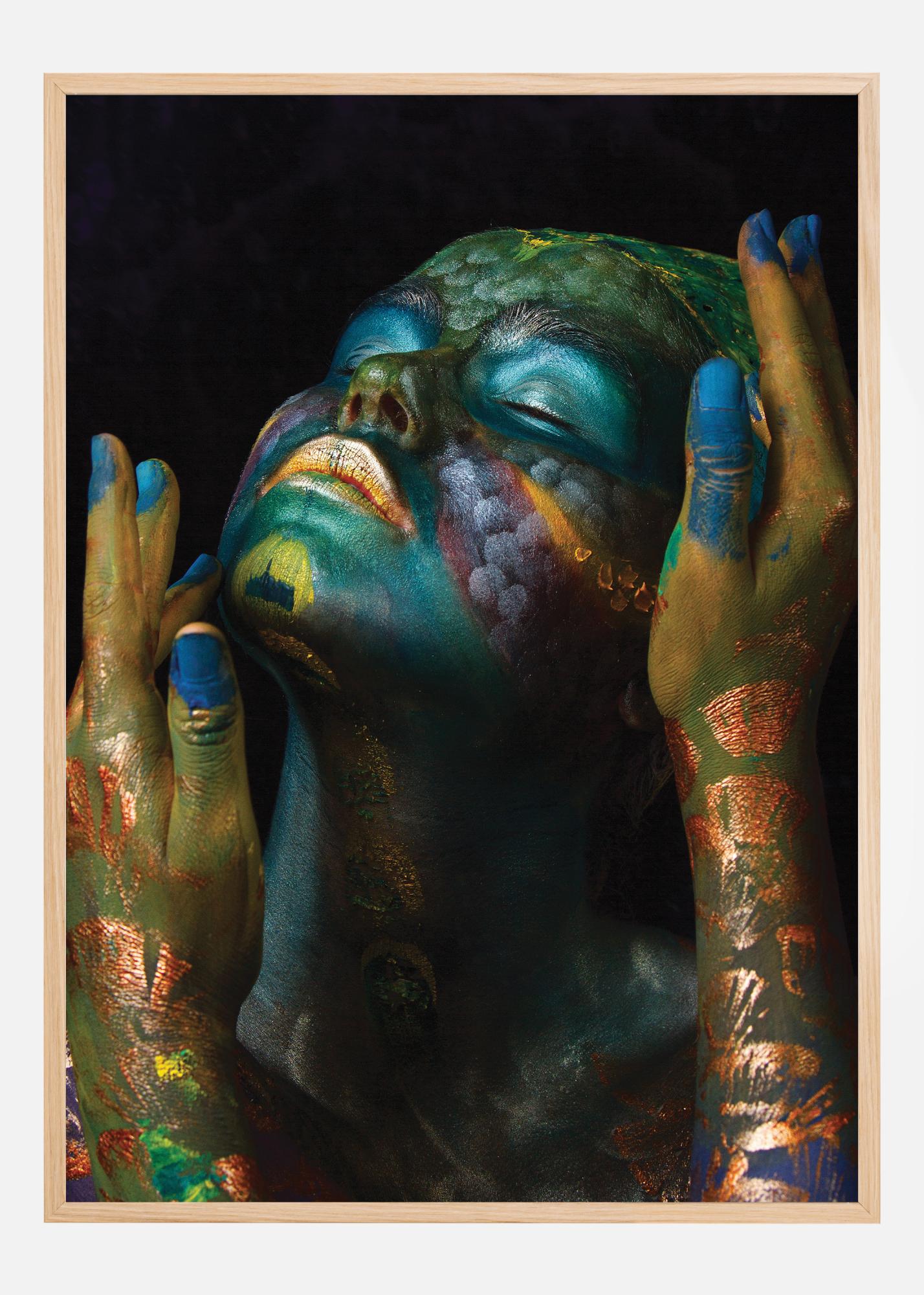 Un poster ritratto multicolore con una donna che inclina la testa all'indietro e incornicia il suo viso con le mani. È coperta da colori brillanti e intensi che creano una bellissima miscela di vivaci colori. Scegli uno dei colori nella pittura e abbinalo al tuo muro per un'espressione extra.