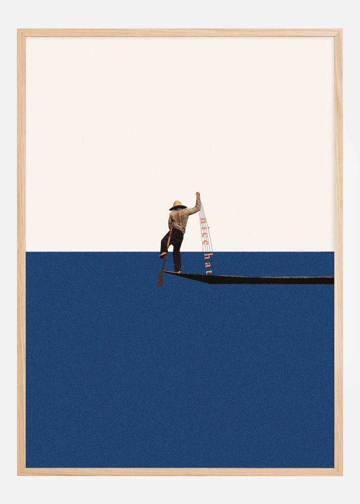 In questo poster creativo e metaforico viene catturato uno scatto di pazienza e aspettativa. Qui è raffigurato un uomo vestito con un classico cappello da pescatore e giacca che si erge saldo su una barca marrone, in netto contrasto con un lago azzurro brillante. Si sporge dal bordo della barca, impegnato nell'arte sottile di "pescare i complimenti" con una vivace canna da pesca rossa e bianca. Questa azione introduce una svolta umoristica al tema tradizionale della pesca e offre un'interpretazione contemporanea dell'arte di cercare e dare apprezzamento.