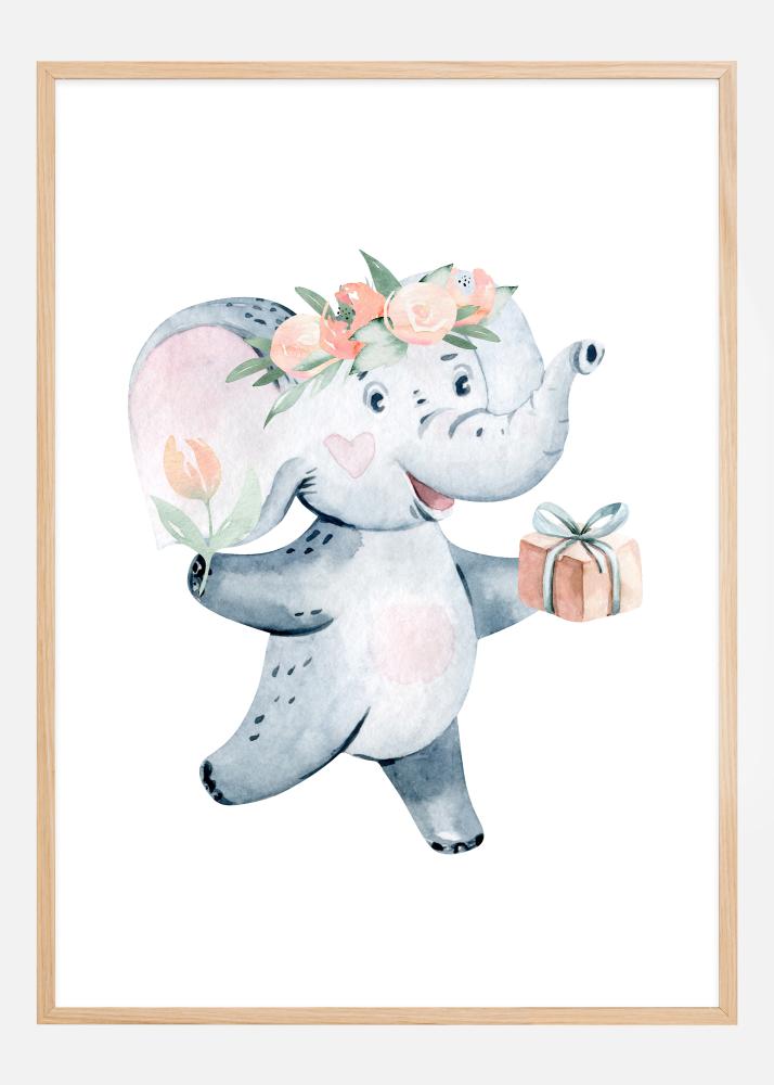 Ravviva l'atmosfera in qualsiasi stanza con questo adorabile poster di elefante, che trasmette gioia e innocenza. Qui è raffigurato un affascinante piccolo elefante grigio che cammina leggero, abbinato a una corona di fiori nei toni del rosa e pesca sulla testa. L'espressione dell'animale è piena di gentilezza e felicità, e tiene un regalo accuratamente avvolto, aggiungendo un tocco extra di gioia e generosità alla scena.