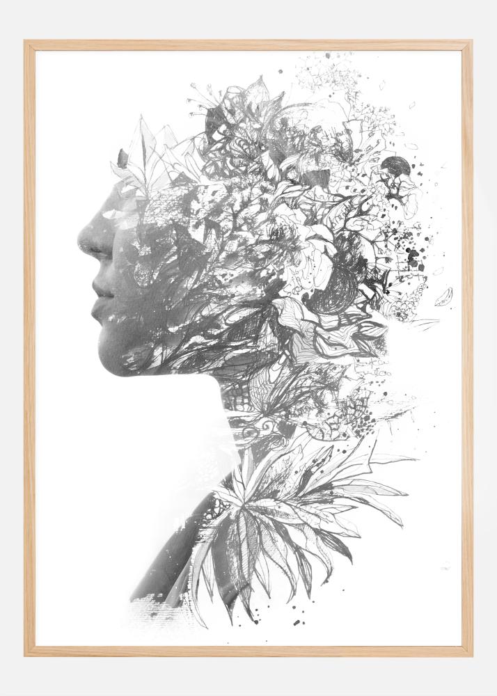 Questo poster artistico combina il profilo di una donna con un'illustrazione dettagliata e intricata di fiori e piante, creando una fusione affascinante tra la figura umana e i dettagli delicati della natura. Lo schema cromatico in bianco e nero conferisce un senso di eternità e mette in risalto la sottile texture e complessità sia della figura umana che dei motivi floreali.