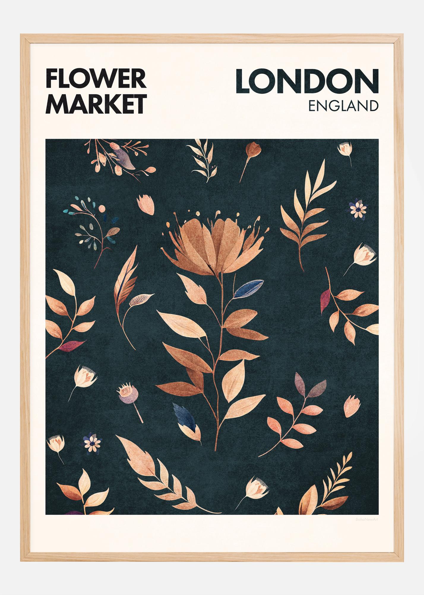 Questo incantevole poster ritrae l'eleganza dei fiori dal famoso mercato dei fiori di Londra. Una sinfonia colorata di vita vegetale che fiorisce nel cuore dell'Inghilterra, presentata con un'illustrazione botanica che raffigura una collezione di fiori e foglie. Il design emana un senso di fascino classico britannico e la bellezza senza tempo della natura.