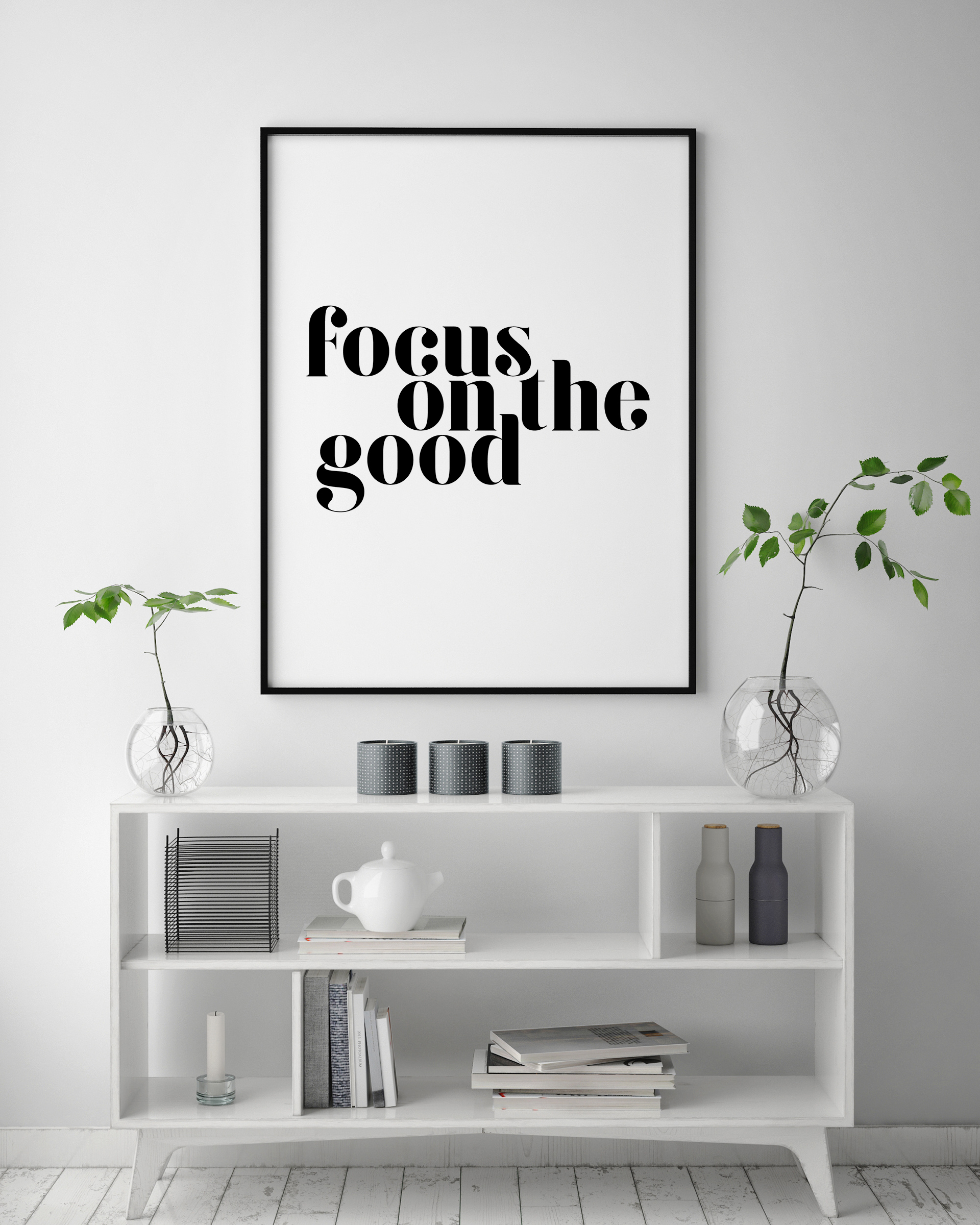 Un poster motivazionale che incoraggia il lettore ad avere pensieri positivi. Concentrarsi sul bene, focalizzarsi sul buono, è la chiave qui e è scritto in un carattere audace su uno sfondo bianco. Inizia la giornata con questa frase potente e molto utile.