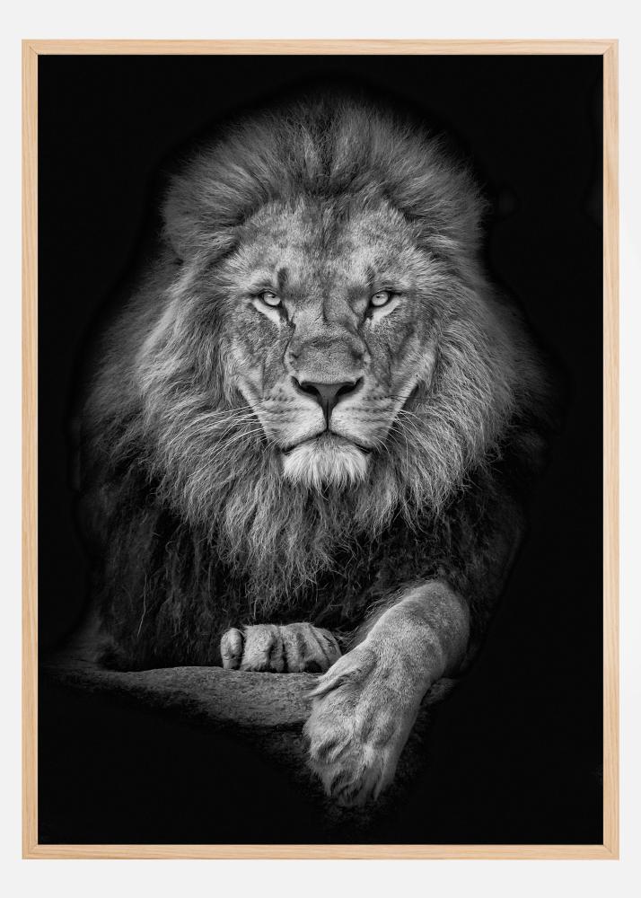 Una fotografia in bianco e nero ravvicinata di un leone che guarda dritto verso lo spettatore. Lo sfondo scuro e lo sguardo intenso creano un'attrazione irresistibile per il quadro. Questo è un poster che si presenta bene sia da solo che insieme ad altri preferiti in un collage più grande.