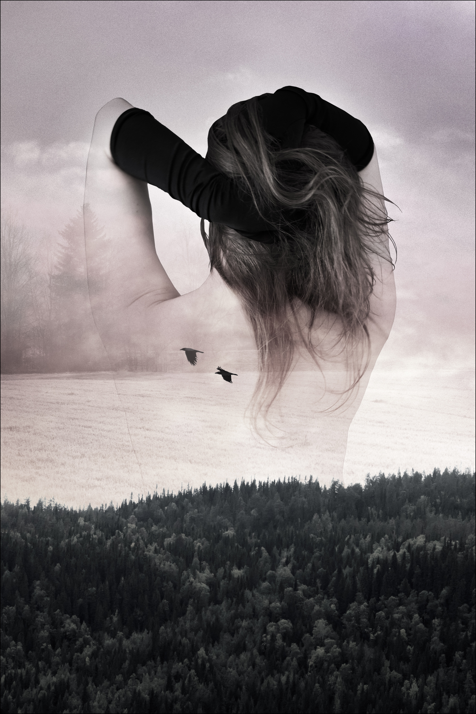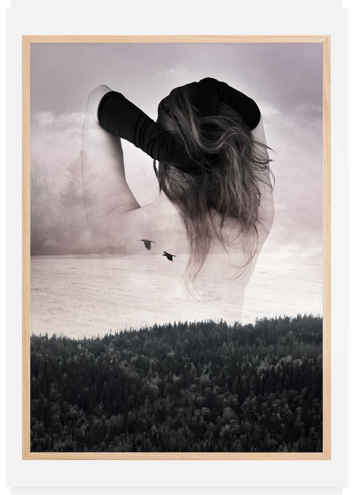 Un poster di collage con bosco e cielo sotto e una donna in primo piano. L'anima della foresta è evidente qui, poiché la foresta oscura raggiunge il cielo dove una donna con un guanto nero passa la mano tra i capelli. Goditi la composizione insolita in questa immagine veramente fantasiosa.