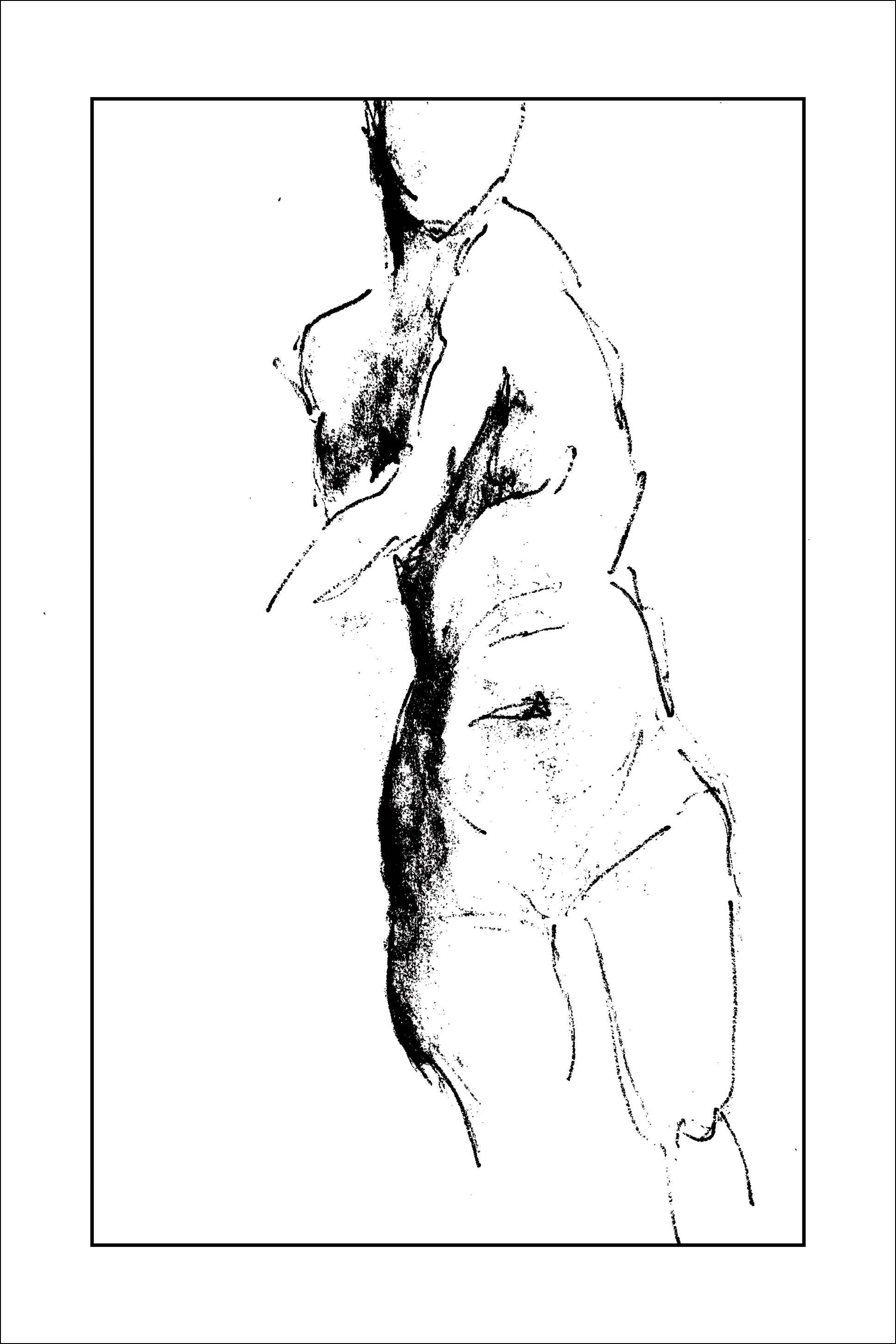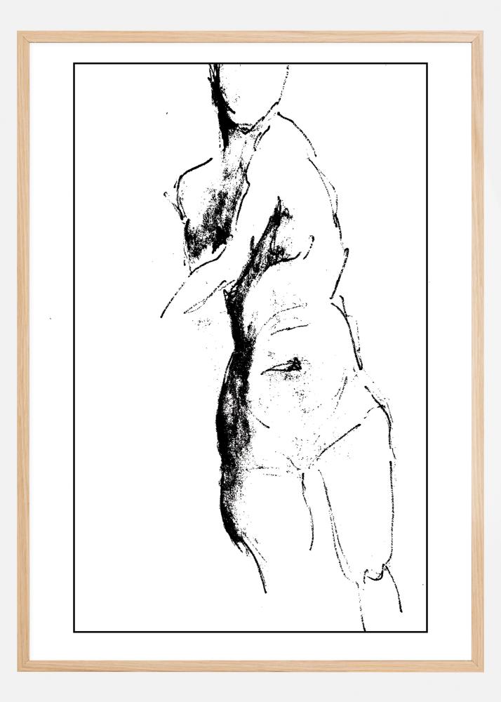 Un poster di disegno di una donna nuda che si gira. Lo stile disegnato di questa immagine aiuta a creare una sensazione di movimento quando la modella si gira e muove le braccia sul petto. Questa stampa in bianco e nero sarà fantastica su una parete colorata.